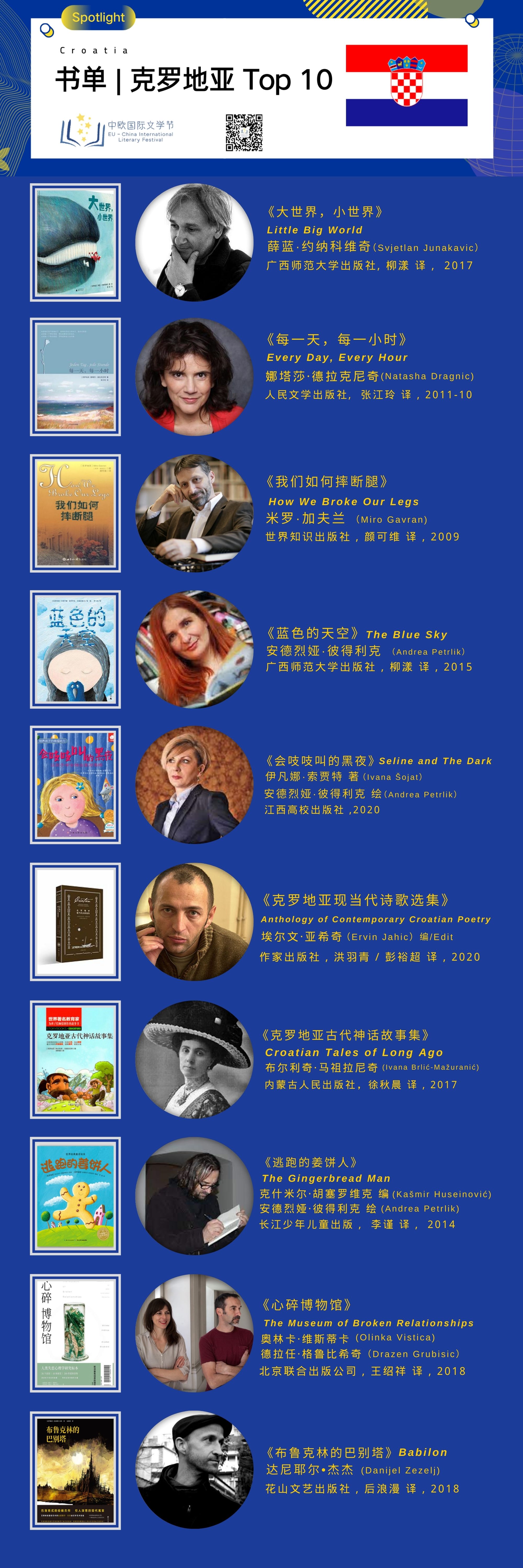 克罗地亚是一片文学沃土,自古以来诞生了非常多优秀的文学作品。克罗地亚文学各类体裁百花齐放,在短篇小说、长篇小说、非虚构、诗歌等领域产出了无数优秀的文学作品,特别突出的,还有充满创意和想象力的儿童文学作品。本次推荐的书单包括:《大世界,小世界》(薛蓝·约纳科维奇/著·绘(Svjetlan Junakavic))、《每一天,每一小时》(娜塔莎·德拉克尼奇(Natasha Dragnic))、《我们如何摔断腿》(米罗·加夫兰(Miro Gavran))、《蓝色的天空》(安德烈娅·彼得利克(Andrea Petrlik))、《会吱吱叫的黑夜》(伊凡娜·索贾特 著(Ivana Šojat)/ 安德烈娅·彼得利克 绘 (Andrea Petrlik))、《克罗地亚现当代诗歌选集》(埃尔文·亚希奇 编 (Ervin Jahic edit))、《克罗地亚古代神话故事集》(布尔利奇·马祖拉尼奇(Ivana Brlić-Mažuranić))、《逃跑的姜饼人》(克什米尔·胡塞罗维克 编 (Kašmir Huseinović) / 安德烈娅·彼得利克 绘 (Andrea Petrlik))、《心碎博物馆》(奥林卡·维斯蒂卡、 德拉任·格鲁比希奇 (Olinka Vistica, Drazen Grubisic))、《布鲁克林的巴别塔》(达尼耶尔•杰杰 (Danijel Zezelj))。欢迎感兴趣的读者朋友们,参考这份书单,开启一趟精彩的克罗地亚文学之旅。