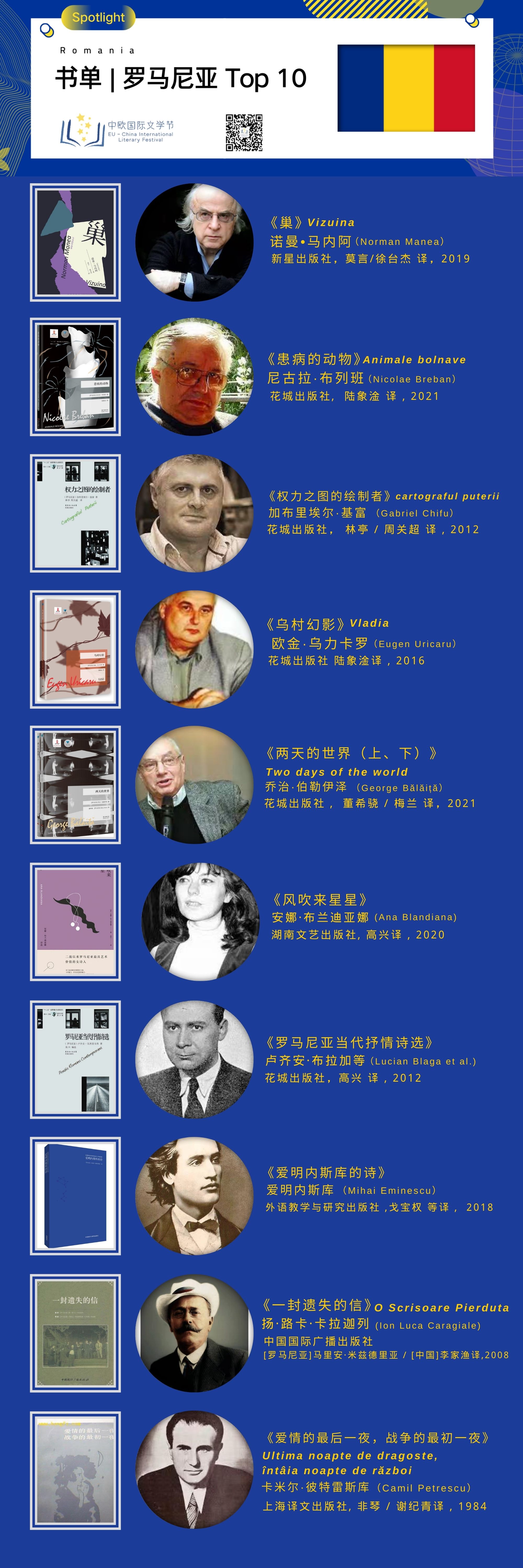本次文学之旅,中欧国际文学节团队特别推荐罗马尼亚 Top 10 文学佳作中译本,入选作品排名不分先后。和其他书单一样,我们的书单也具有一定的主观性,并不是绝对权威的。我们的出发点,是希望推荐给读者朋友们一些好书,在此特别感谢中欧国际文学节团队及出版业同行的专业建议。