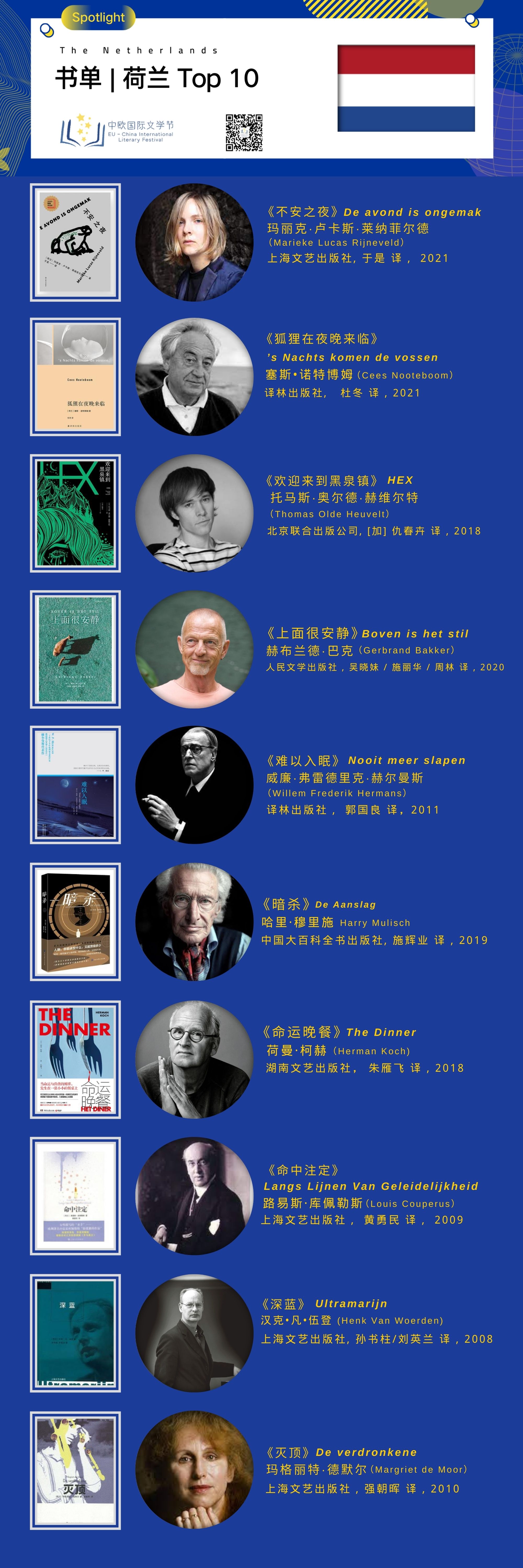 荷兰是一片文学沃土,诞生了许多非常优秀的作品。13世纪产生了荷兰民间文学。当时以佛兰德为中心的南方,由于受法兰西文化的影响以及市民阶级的觉醒,陆续出现了骑士传奇、《列那狐》等动物故事和宗教诗等文学作品。本次推荐的荷兰书单包括:《不安之夜》(玛丽克·卢卡斯·莱纳菲尔德(Marieke Lucas Rijneveld))、《狐狸在夜晚来临》(塞斯•诺特博姆(Cees Nooteboom))、《欢迎来到黑泉镇》(托马斯·奥尔德·赫维尔特(Thomas Olde Heuvelt))、《上面很安静》(赫布兰德·巴克(Gerbrand Bakker))、《难以入眠》(威廉·弗雷德里克·赫尔曼斯(Willem Frederik Hermans))、《暗杀》(哈里·穆里施(Mulisch Harry))、《命运晚餐》(荷曼·柯赫(Herman Koch))、《命中注定》(路易斯·库佩勒斯(Louis Couperus))、《深蓝》(汉克•凡•伍登(Henk Van Woerden))、《灭顶》(玛格丽特·德默尔(Margriet de Moor))。