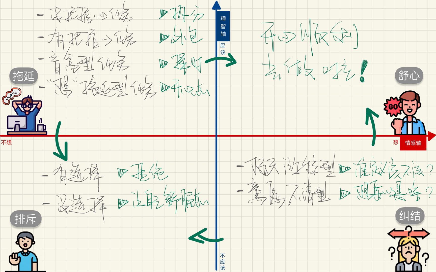 画出万能的四象限后,不同事情的处理策略变得很清晰,做理智与情感保持一致的选择,祝你怡然自洽!