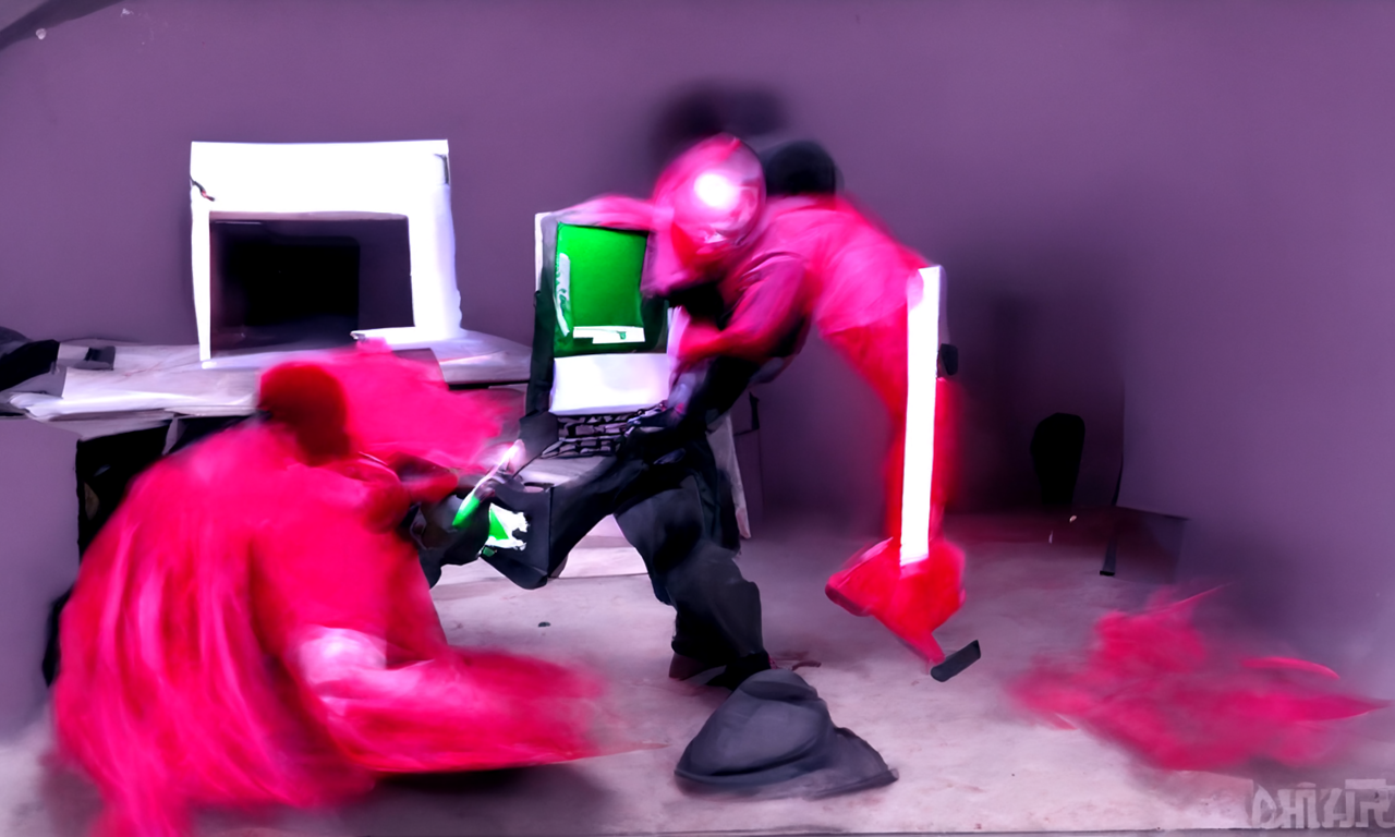 这幅画是我们在录制当中,算法跑出来的图像。文字描述为:A red computer is beating a man with a green hammer, dark scheme