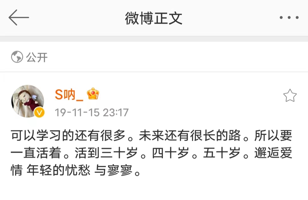 希望我可以做一个可以很快从焦虑心情里挣脱出来的人。很喜欢的博主“s呐_”的微博置顶写着“可以学习的还有很多。未来还有很长的路。所以要一直活着。活到三十岁。四十岁。五十岁。邂逅爱情,年轻的忧愁 与寥寥。”是呀,我要好好活着“邂逅爱情,年轻的忧愁与寥寥”。