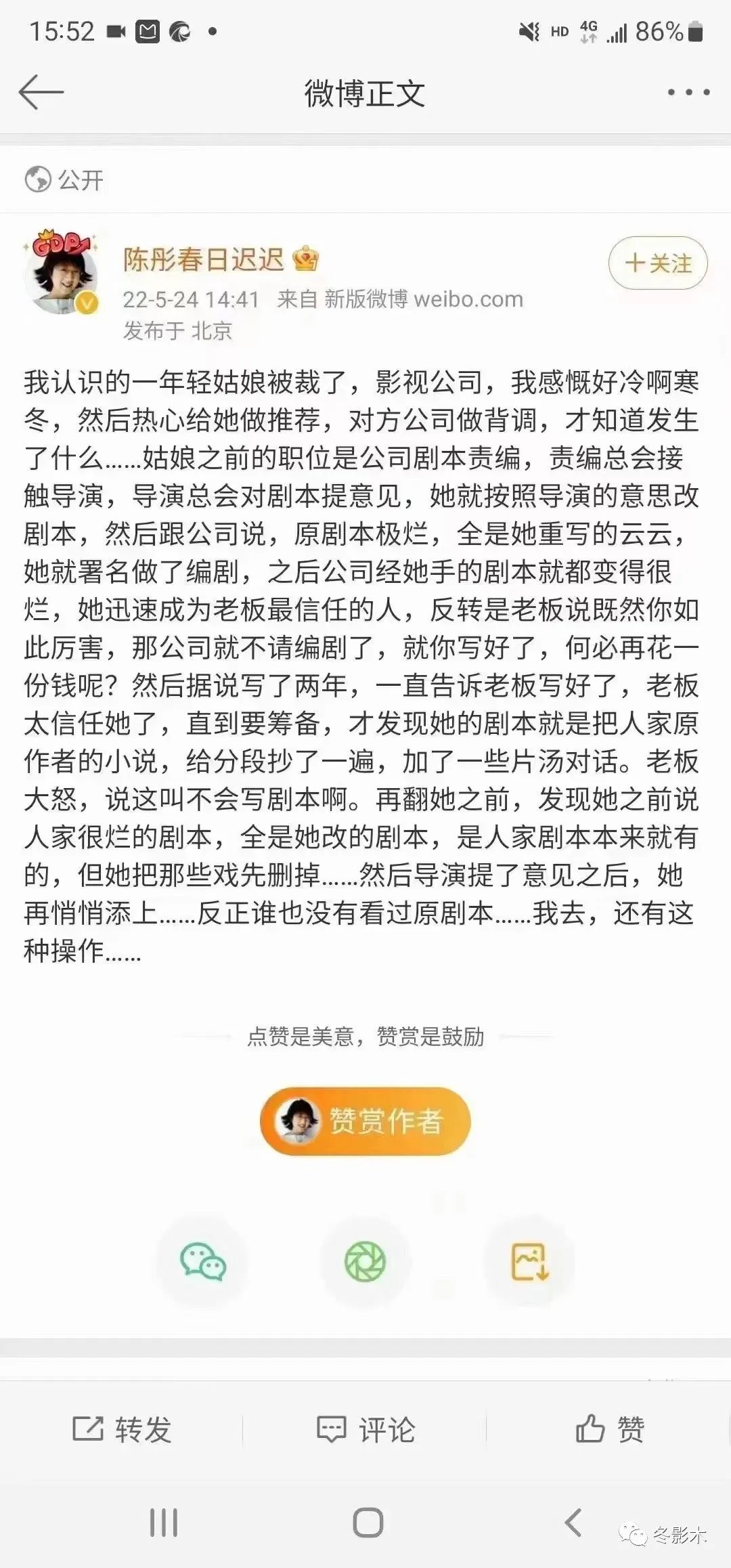 “如果我们大家都不愿意为自己的权利去发声,那么我觉得可能吃亏的未来都不止编剧,就刚才说的责编也有很惨,导演也有很惨的制片有很惨的就是一损俱损的一个行业。”