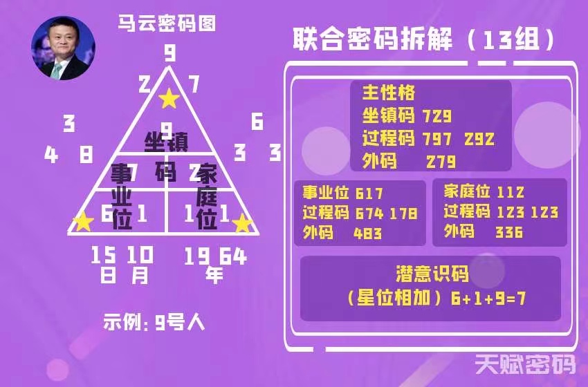 三角形的外面有3*3一共9个数字,这3组数字分别代表着我们的早年中年和晚年的运势,通过对这三组数字的解读,我们能看到一个人一辈子运势的起伏和需要注意的地方。