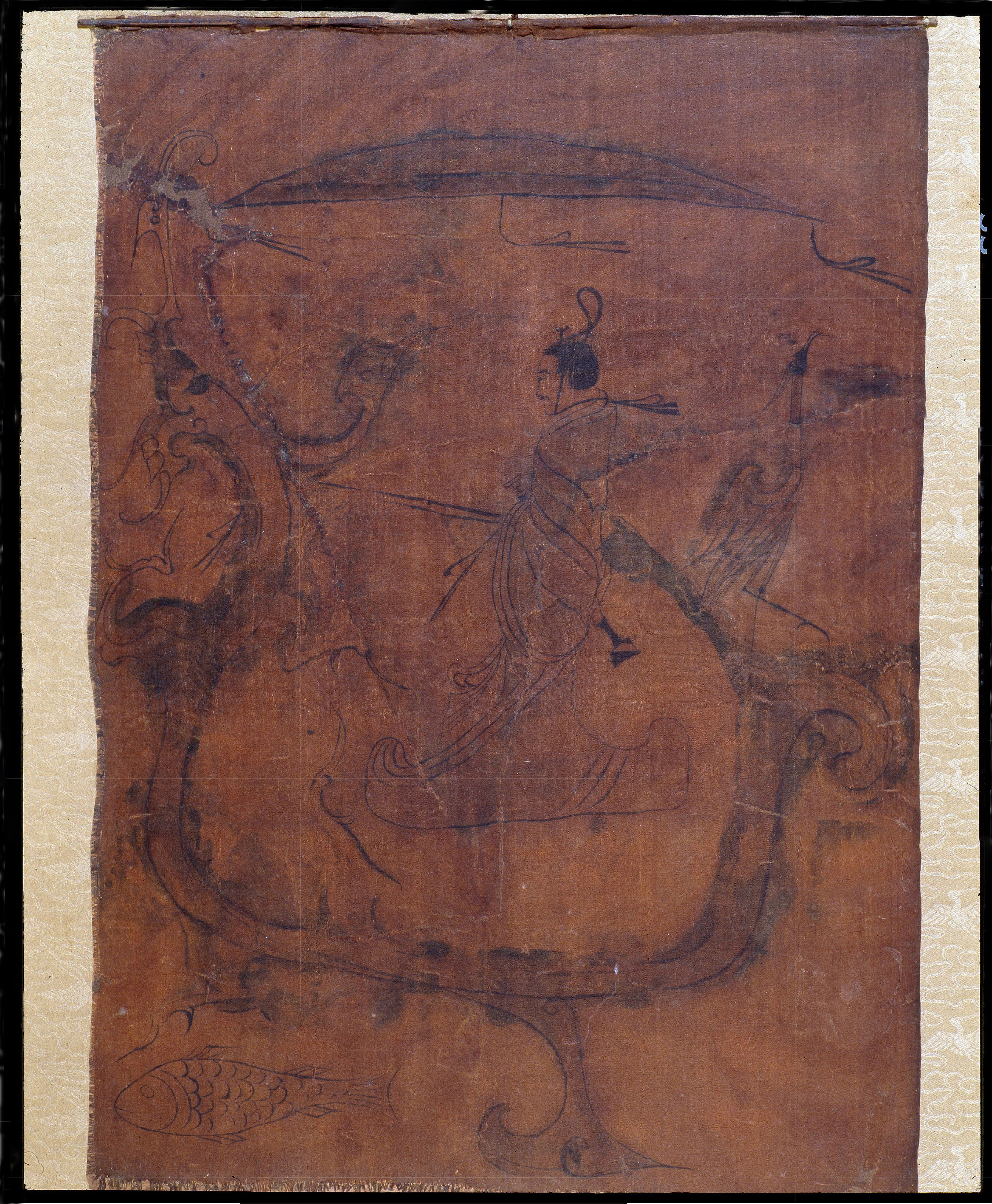 系于人物颈间的冠带随风飘起,生动表现出墓主御龙而行的潇洒姿态。其长衣袭地往上卷出一小舟形,或像文房笔架状,与《人物龙凤图》有异曲同工之妙。在龙的尾部和身侧,还分别绘有白鹤和游鱼。龙尾上站立的鹤鸟,又似凤,仰首向天,神态轻盈自在。与龙一样,这些出现在铭旌上的动物,可能也被楚人赋予辅助墓主灵魂升天的神异力量。