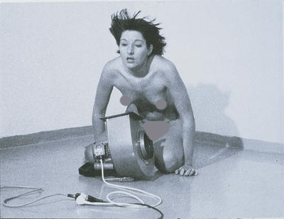 玛丽娜全身赤裸地趴在地上面对着一台大功率工业鼓风机,试图把肺吹到炸掉,在这次表演中她再次失去意识。