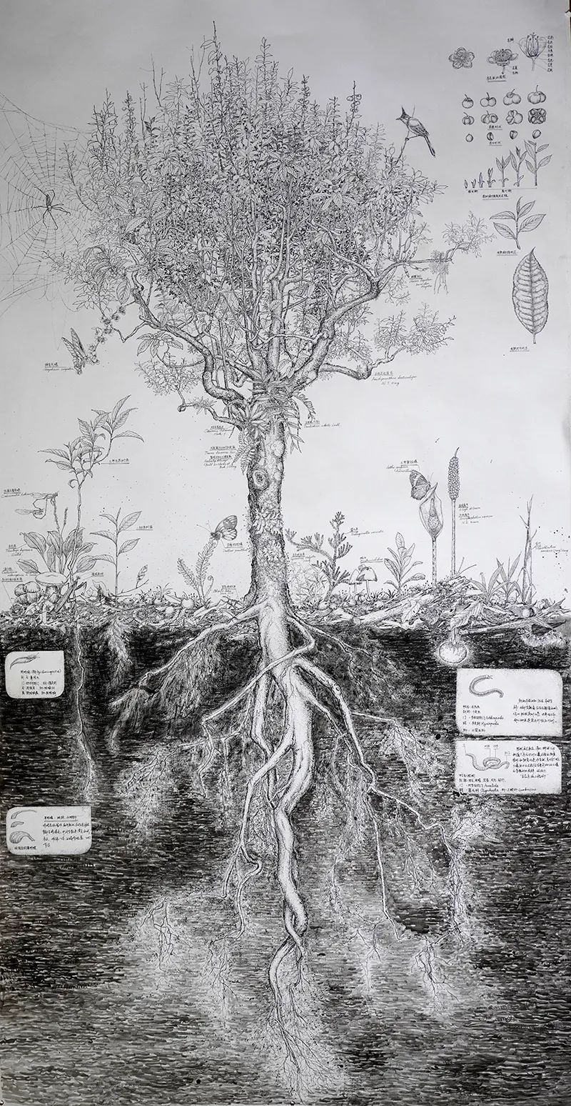 资佰博物绘画《一棵茶树的理想国》——大叶种乔木型茶树的生态系统,尺寸:193.6cm×100cm,年代:2020