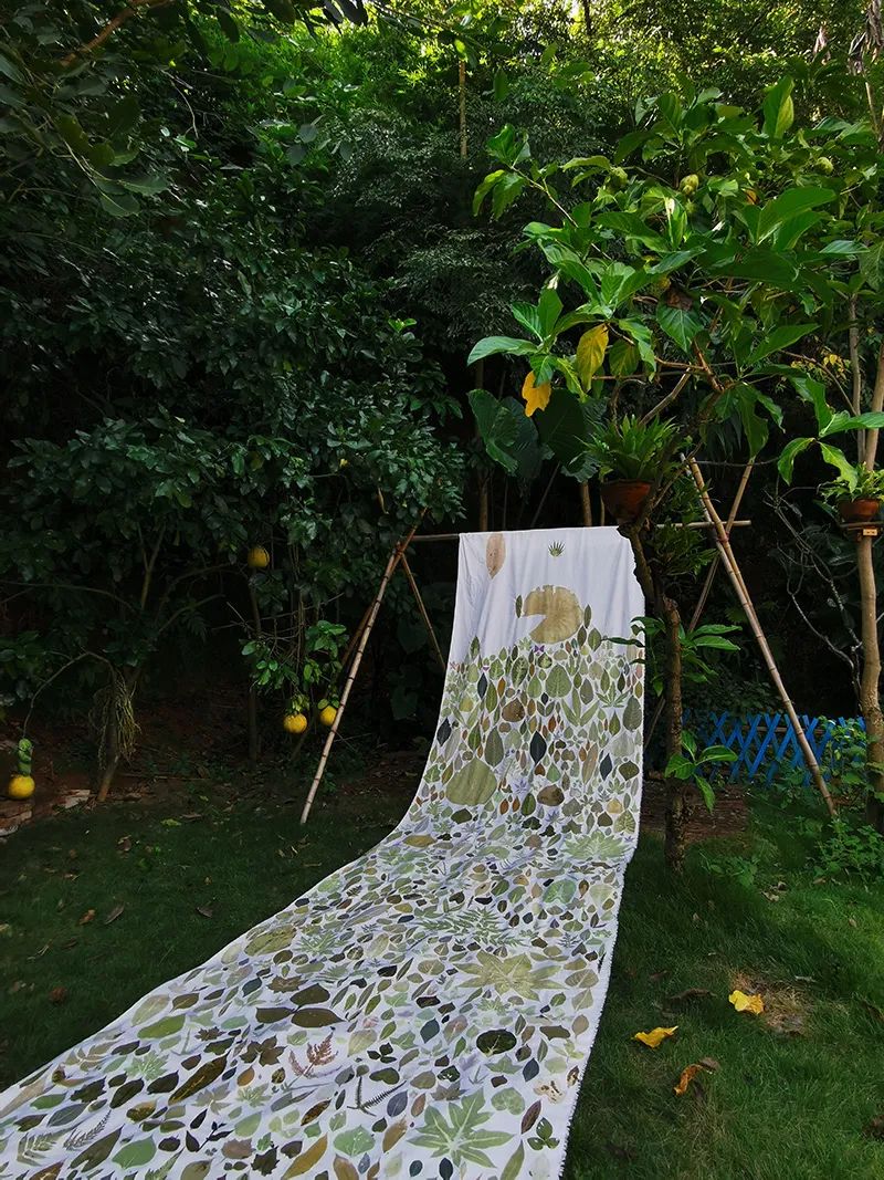39:20鸿雁:和资佰一起做茶山田野调查,展开“拓印森林”的工作,采集树叶……描绘一片可以治愈的森林……树叶的生命只有一年,转移到布上以后可以得到延续……见证生命色彩退场的变化,也从中筛选做染料的叶子,总结经验。