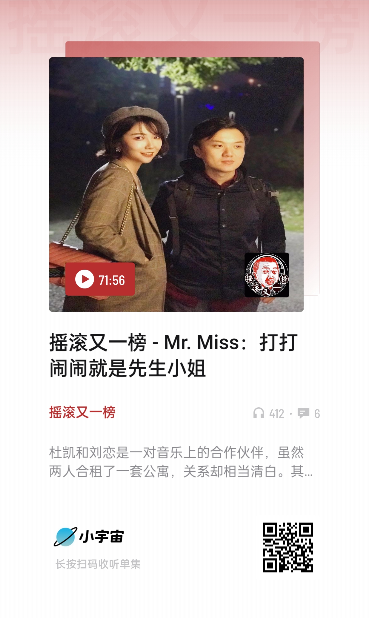 感谢小宇宙,在播客这个新兴领域,小宇宙的自由程度远超于其他平台。在对Mr.Miss这两位一男一女关系的好奇中(我俗气我先说),听了大多数他们身为嘉宾的播客: