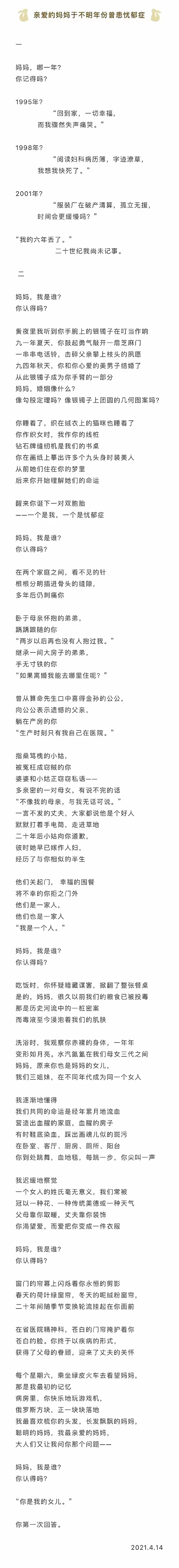 我迟缓地察觉一个女人的姓氏毫无意义,我们常被冠以一种花、一种传统美德或一种天气父母靠你取暖,丈夫靠你装饰你渴望爱,而爱把你变成一件衣服——待兔祝所有女性都不再是姐姐、妻子、母亲而只是你自己BGM:珂拉琪 - 万千花蕊慈母悲哀