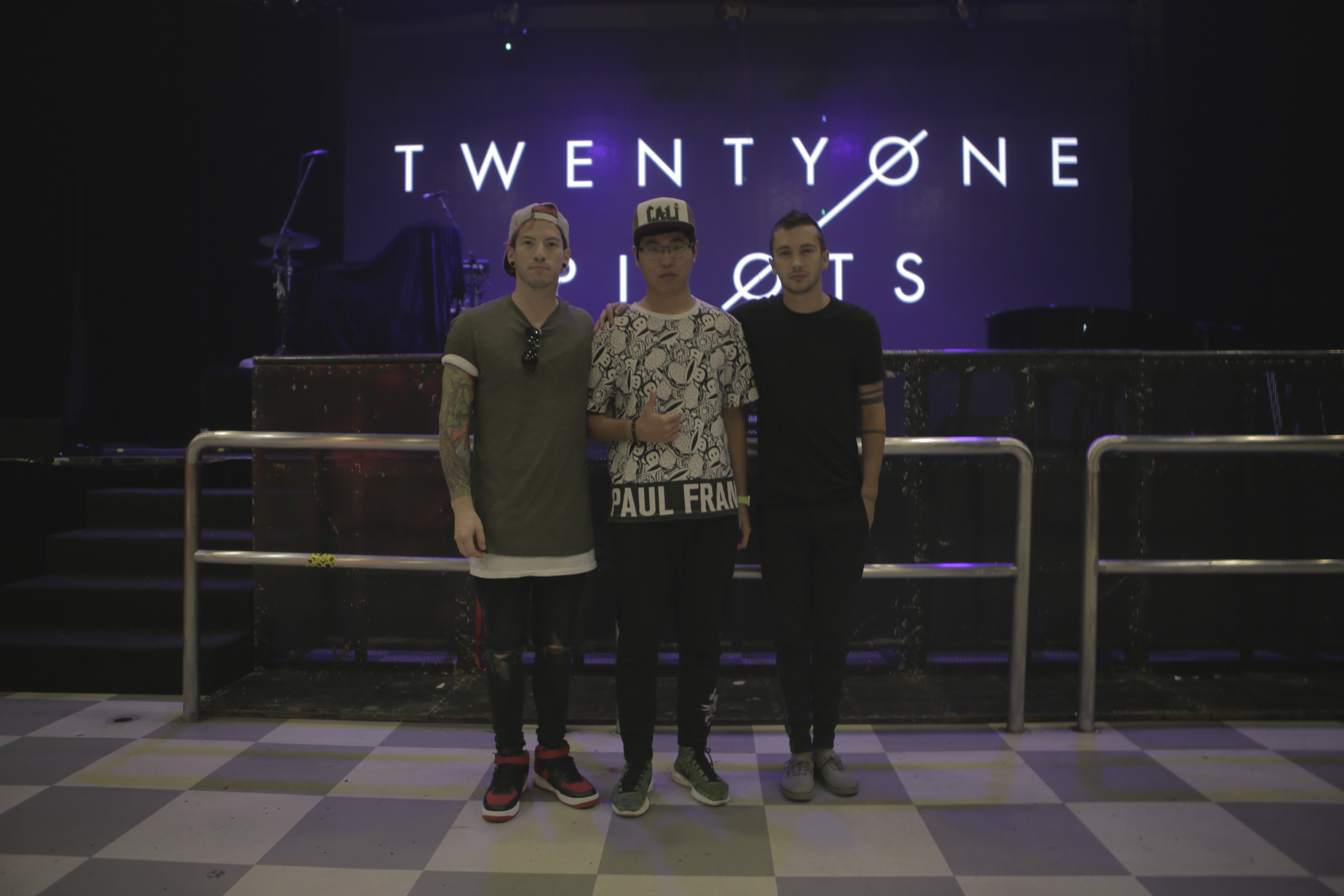 2015年,Cali 与 twenty øne piløts 在上海的 Meet n Greet 合影留念
