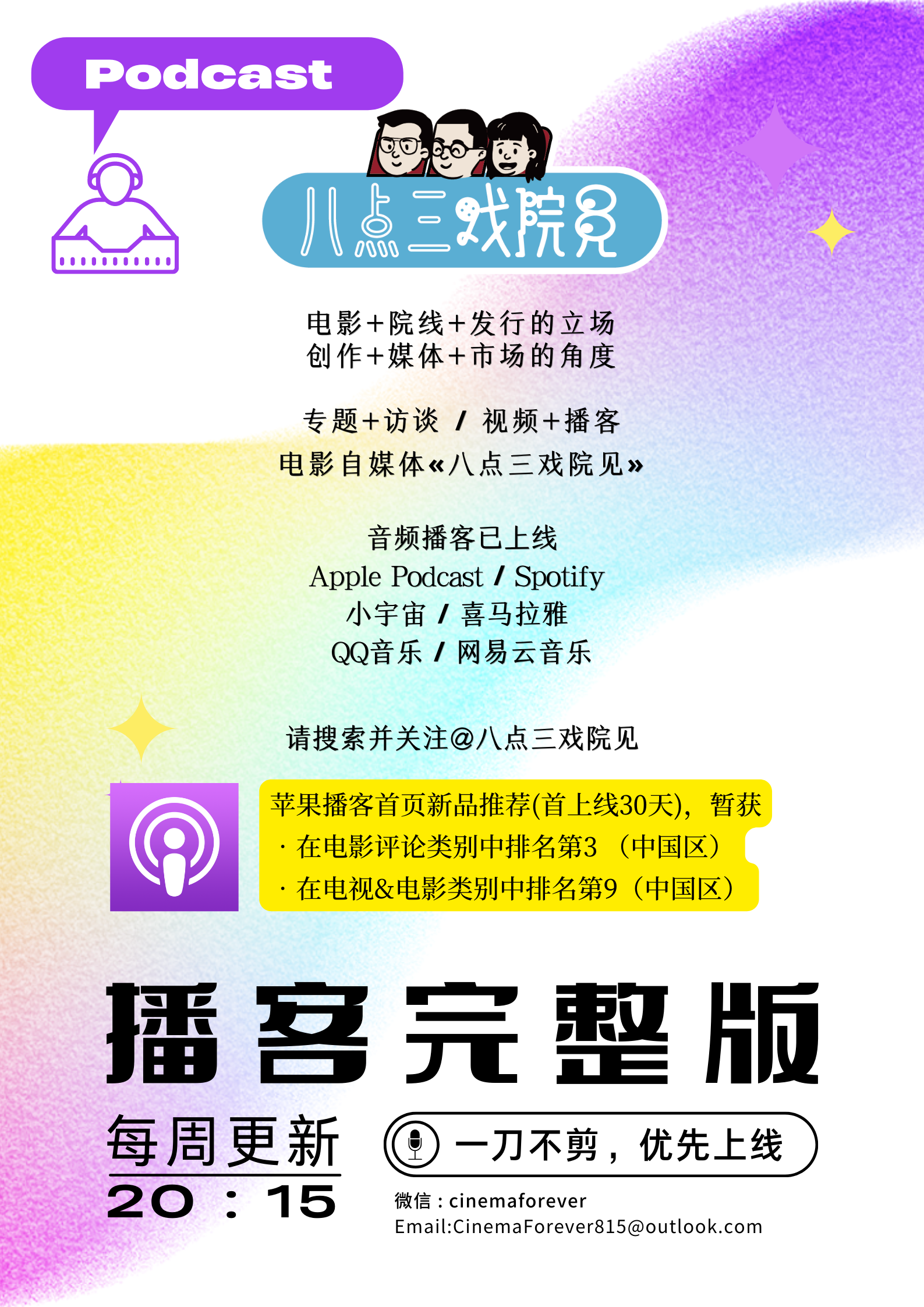 温馨提醒:从本期开始,《八点三戏院见》音频和视频双版本分发,各有特点:播客版基本为录制时候的完整版,力求沉浸收听,优先上线;同期的视频版本会文火精,干货干脆。不同风格,不同选择,为两种不同平台和喜好的影迷服