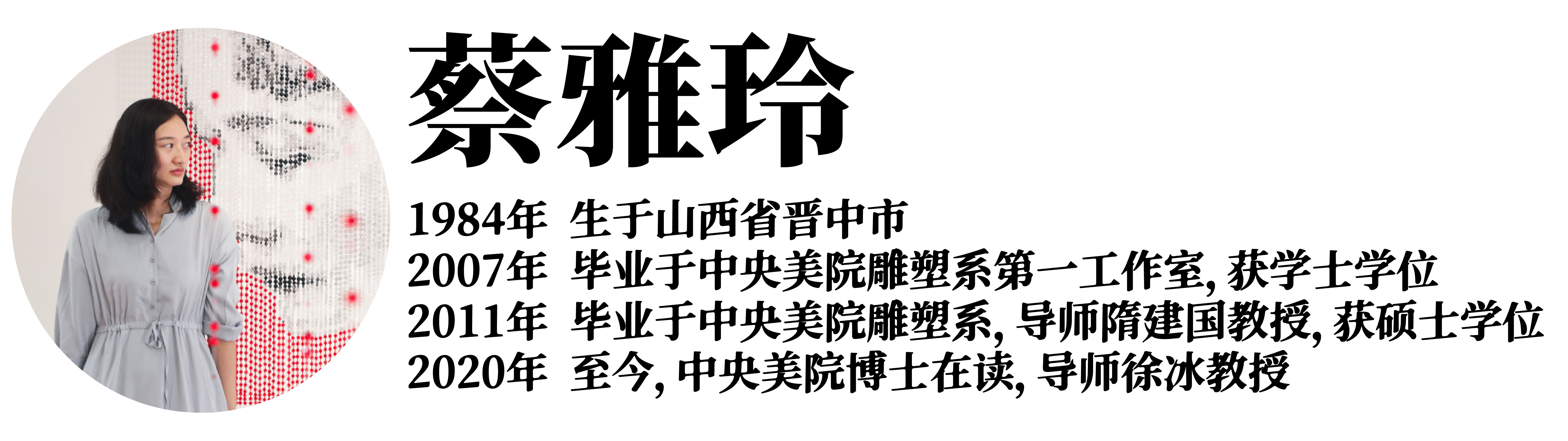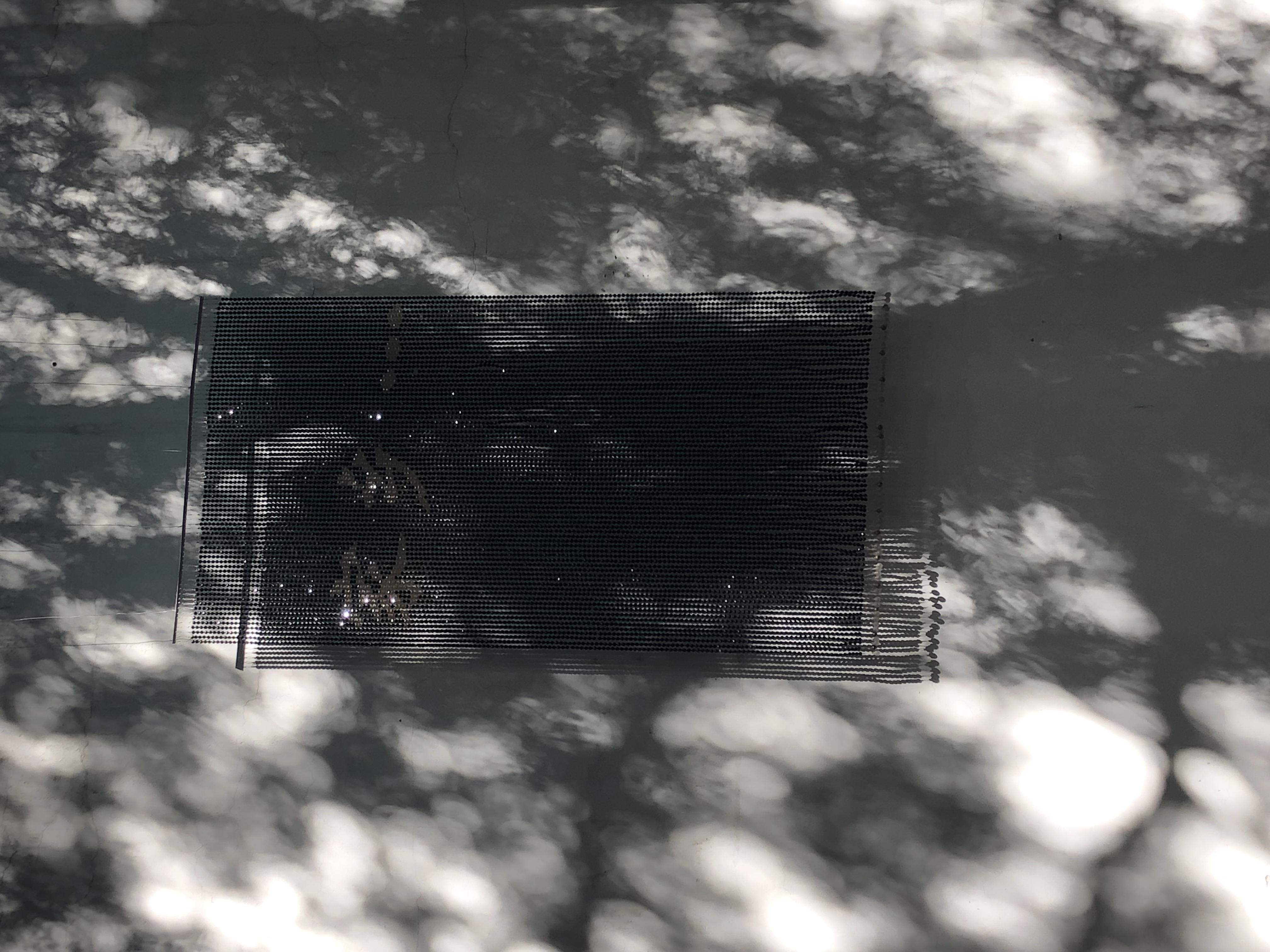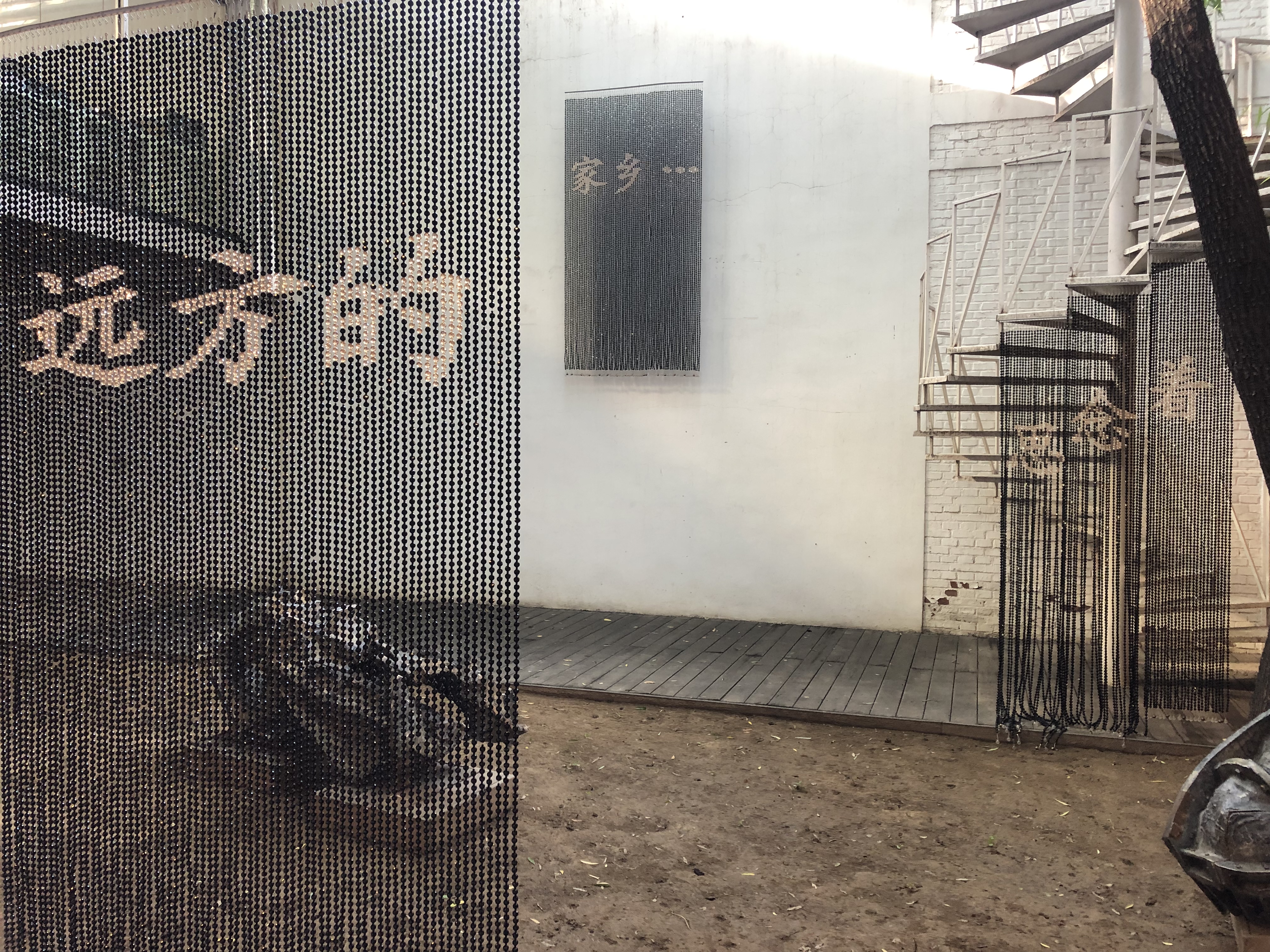 在蔡雅玲的作品《黑盒子》中,玻璃珠帘构成了一个黑色的矩阵,观众可以轻易的进出,在穿梭过程中体会内外的世界。从内部可以读到帘子上方的一行文字“我凝望、思念着远方的家乡…”串珠,这一材料在刻板印象中,多存在于闺房。但细小又有重量的串珠,可以在编织中形成极大的体量。晶莹剔透的黑色珠帘折射出来的亮光是情绪中的细腻敏感表现出来的内部博弈,发生在我们每个人身上,拉扯着这个世界和内心不一致的东西。装置在走向公众的同时,以一种柔软的方式走向了情感、私人与伤痛,走向了个体经验。