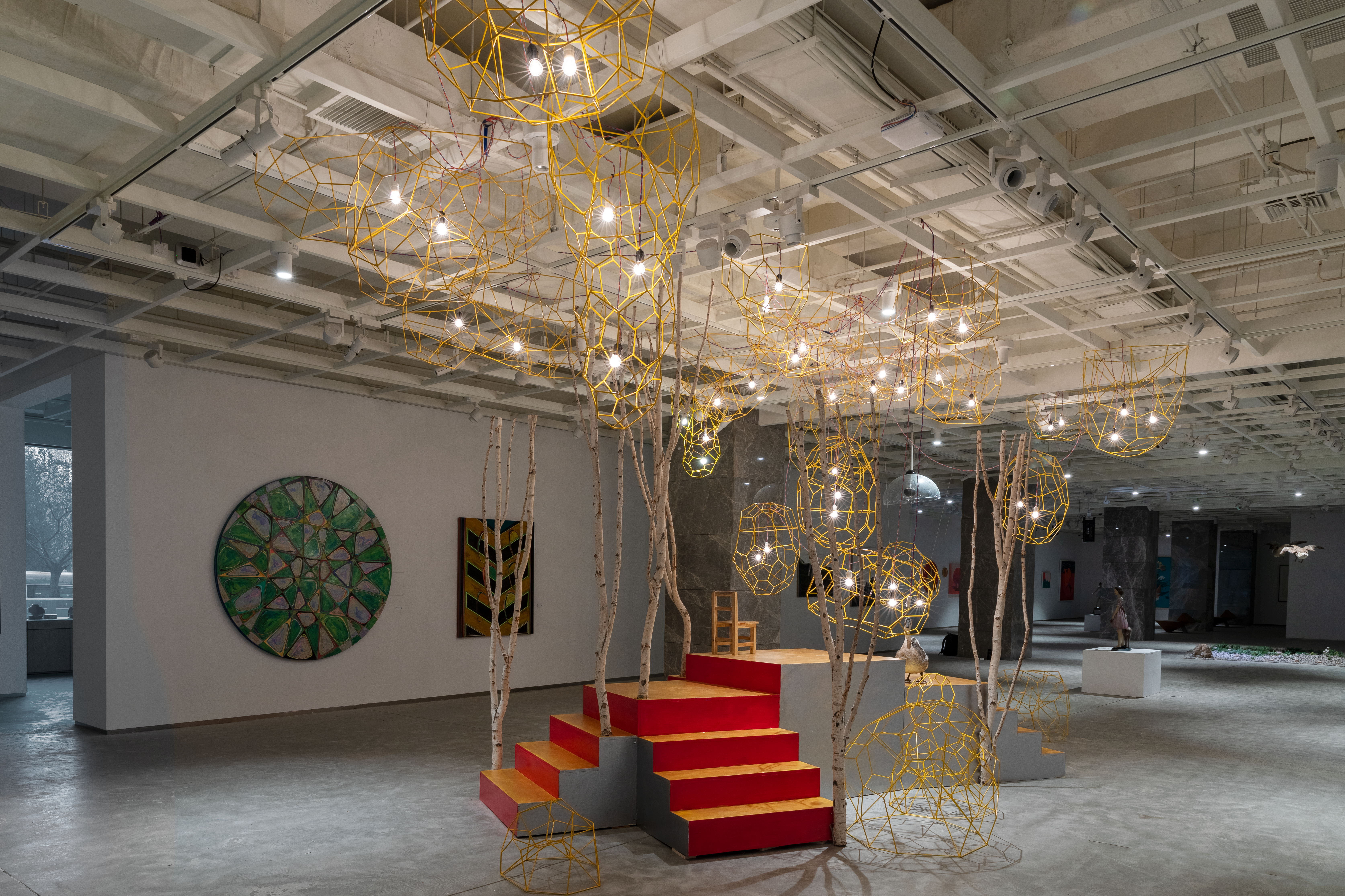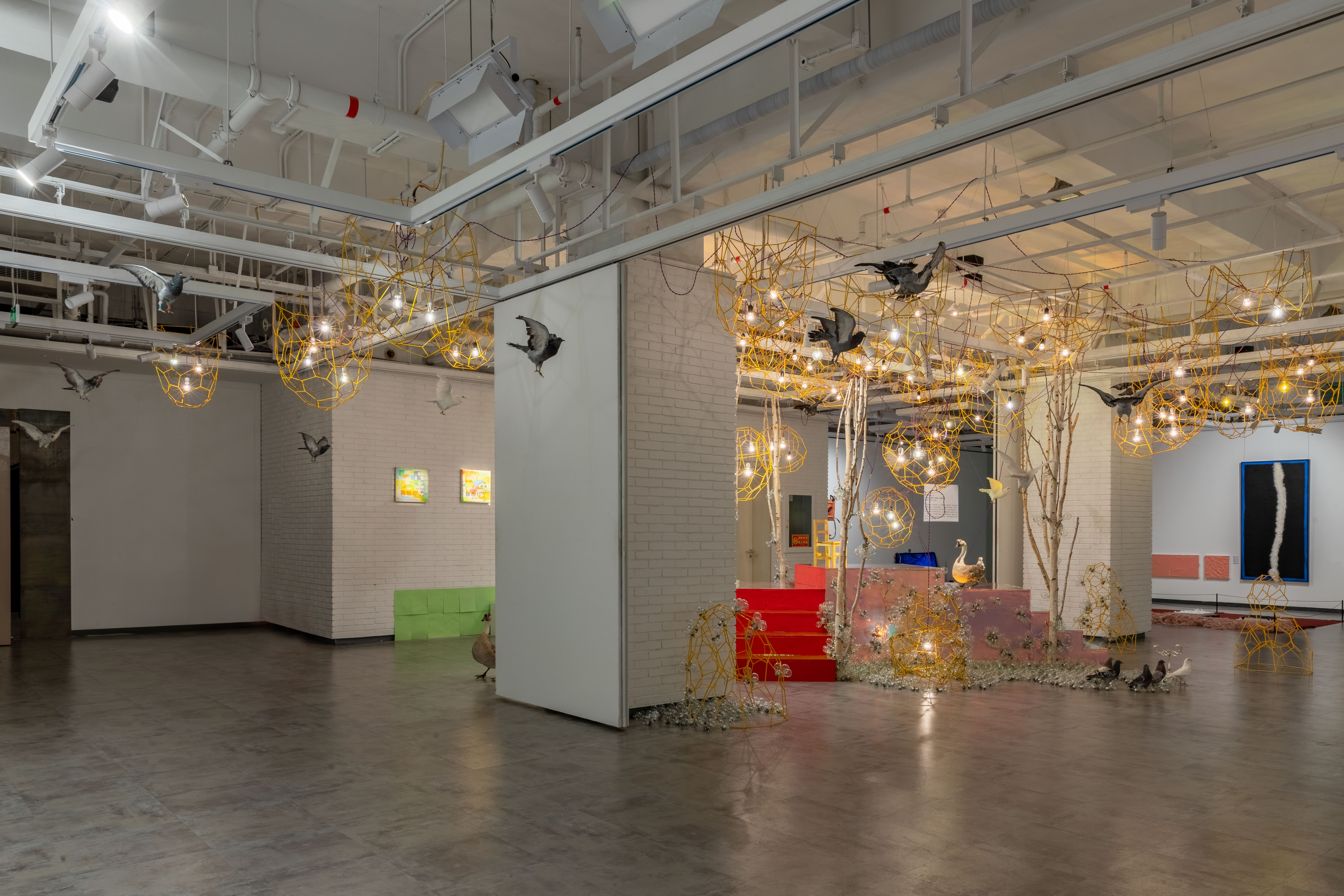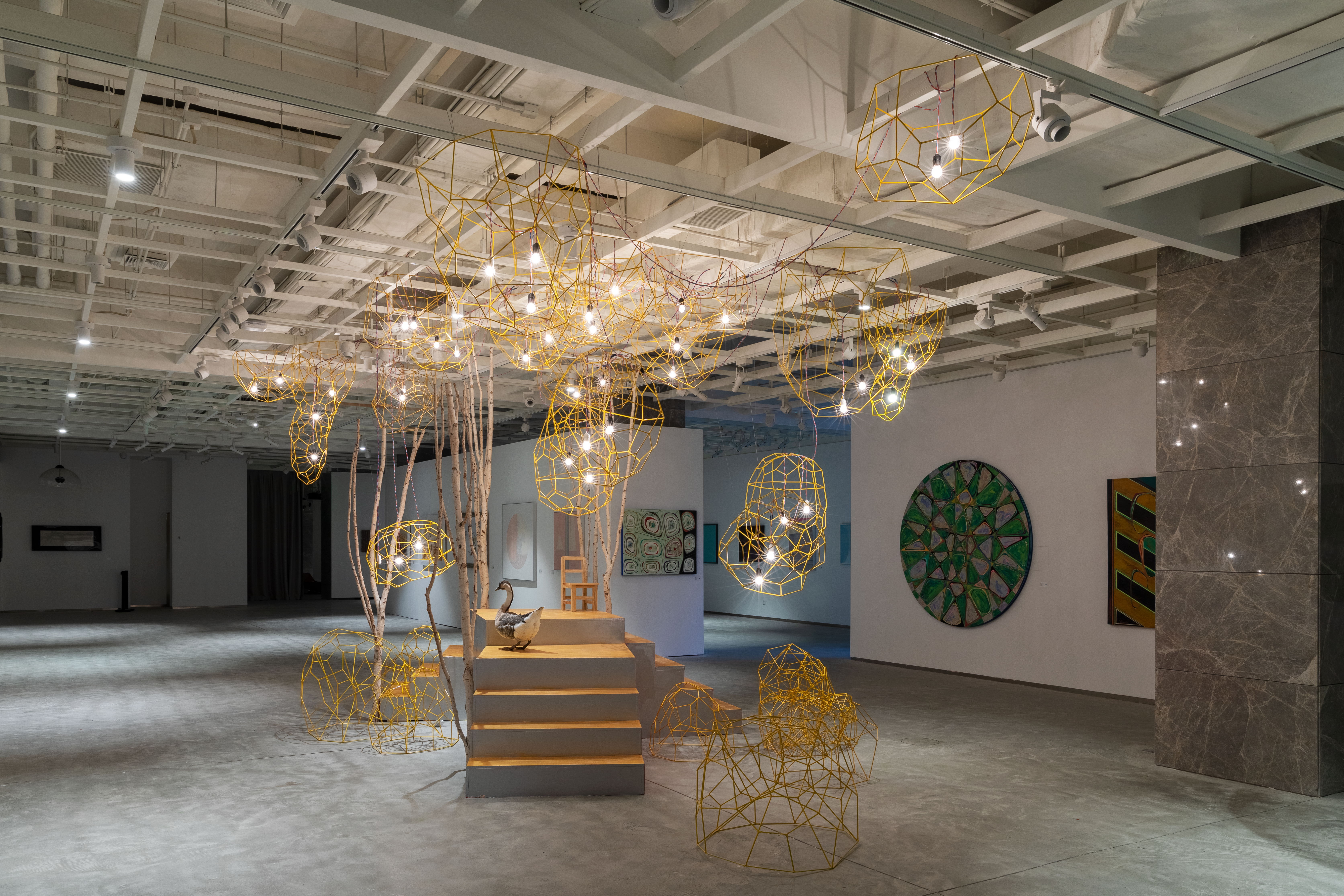 在李琳琳的作品《蔓延》中,将回收的工业钢筋废料重新焊接成泡泡的造型,通过用钢筋焊接的方式,将生活中这种象征短暂美好又易破灭的泡泡定格,几十盏最低瓦数的暖光钨丝灯泡串联在一起形成点亮整个空间的能量。当观众放慢脚步、融入作品环境之中,会不由得产生一种仰望星空的美好和宁静的氛围感,形成一种身临其境的观赏体验;大量金色的“泡泡”和暖光钨丝灯泡悬浮于空中,也唤起了一种自然的美,能量的聚集,并试图探索人与自然与生活之间的关系,创造一种多感官的艺术实践装置。