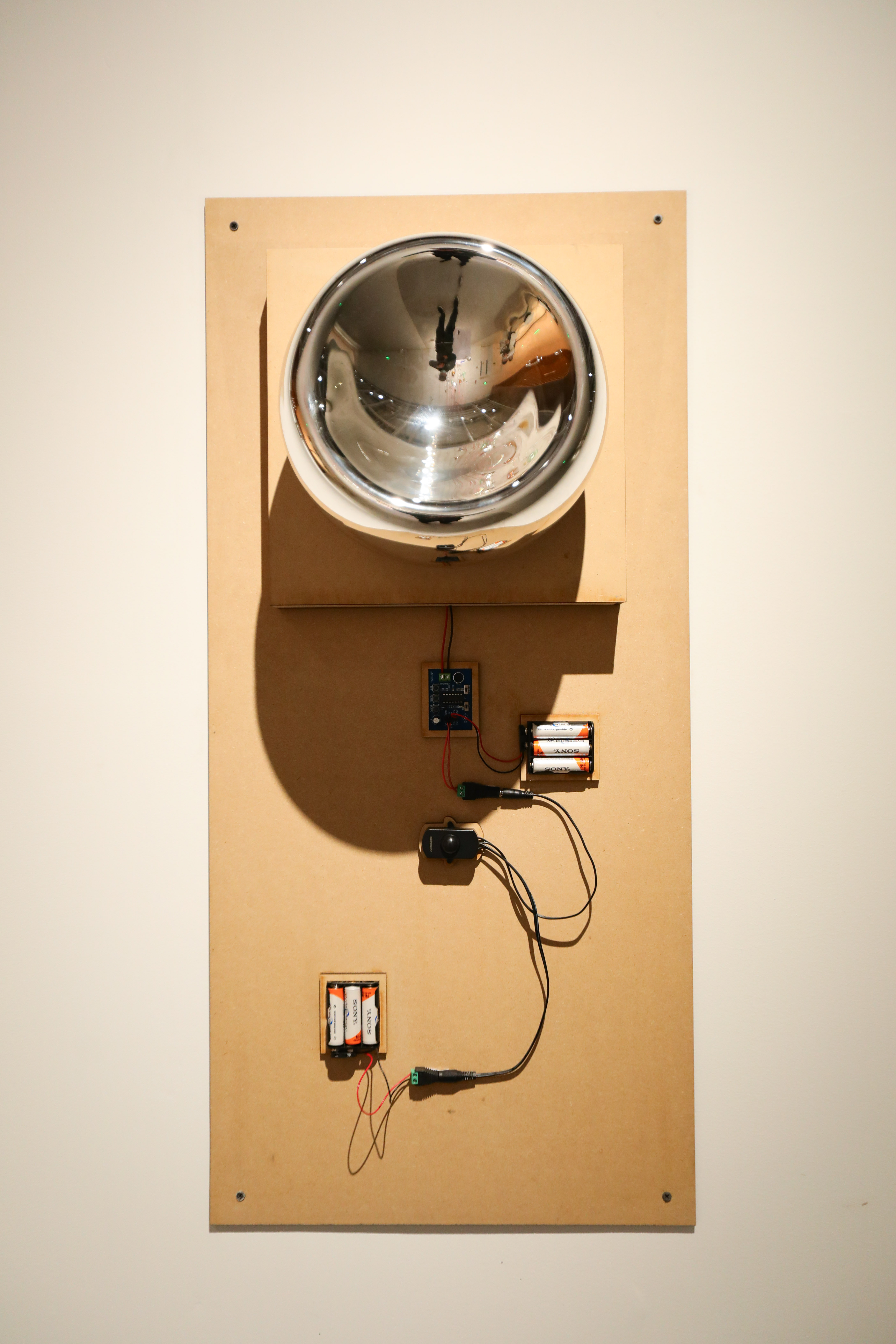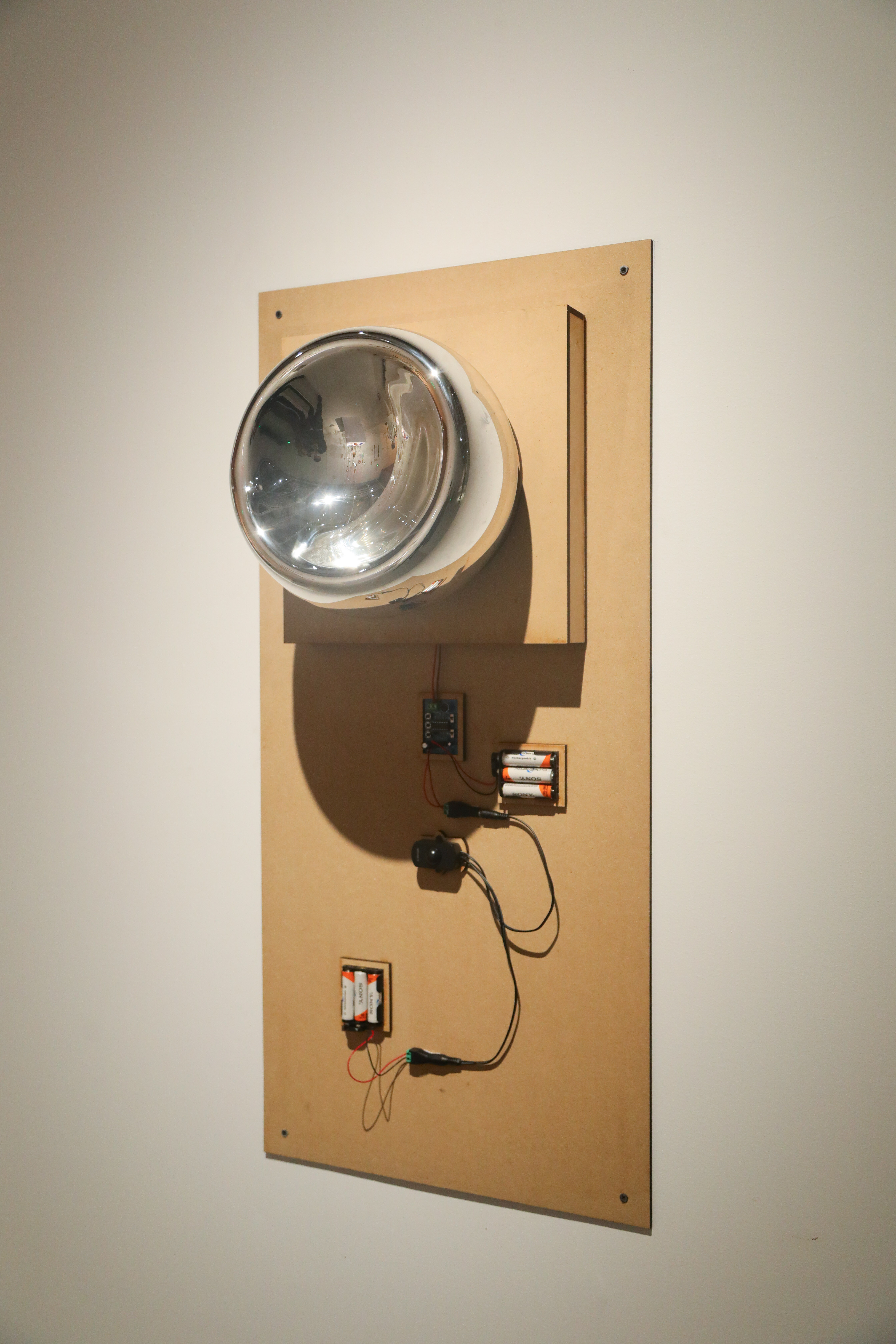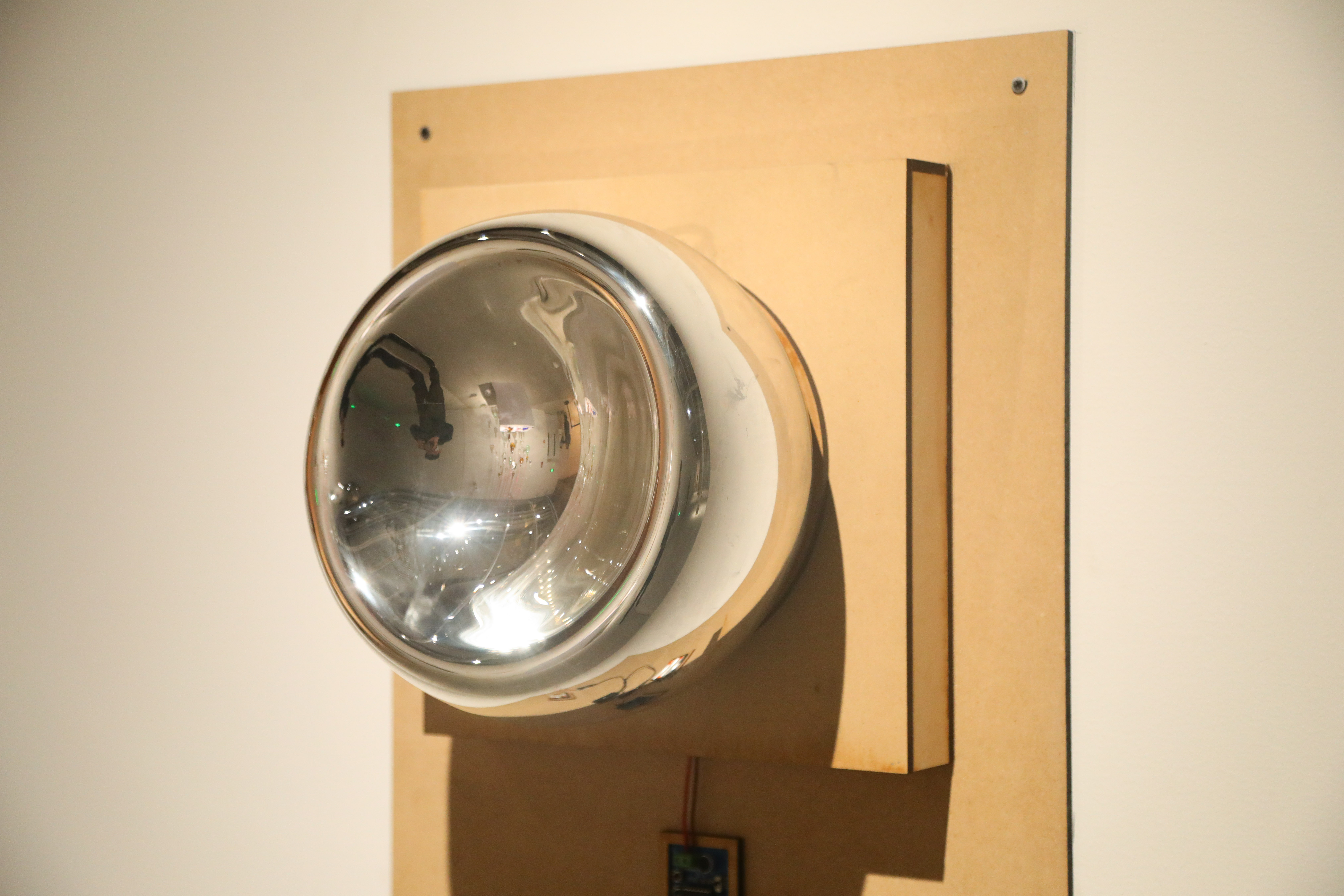 当有人靠近慕晨扬的作品《Hi你好》时,就会听到隐藏在一个变形玻璃球中的扬声器发出“你好”的声音。“你好”通过变形的玻璃和电子传达出来的声音而带有一种机械的、变形的感觉,同时,观众可以通过玻璃看到变形扭曲不自然的自己。至于玻璃凹陷的形状,其实是个偶然,是吹制的时候泡泡过大、顶部太薄、温度太高导致它自己瘪进去了,如一面哈哈镜,透过它变形的景象联想到和那种不带有感情、机械的社交关系里的“变形”。