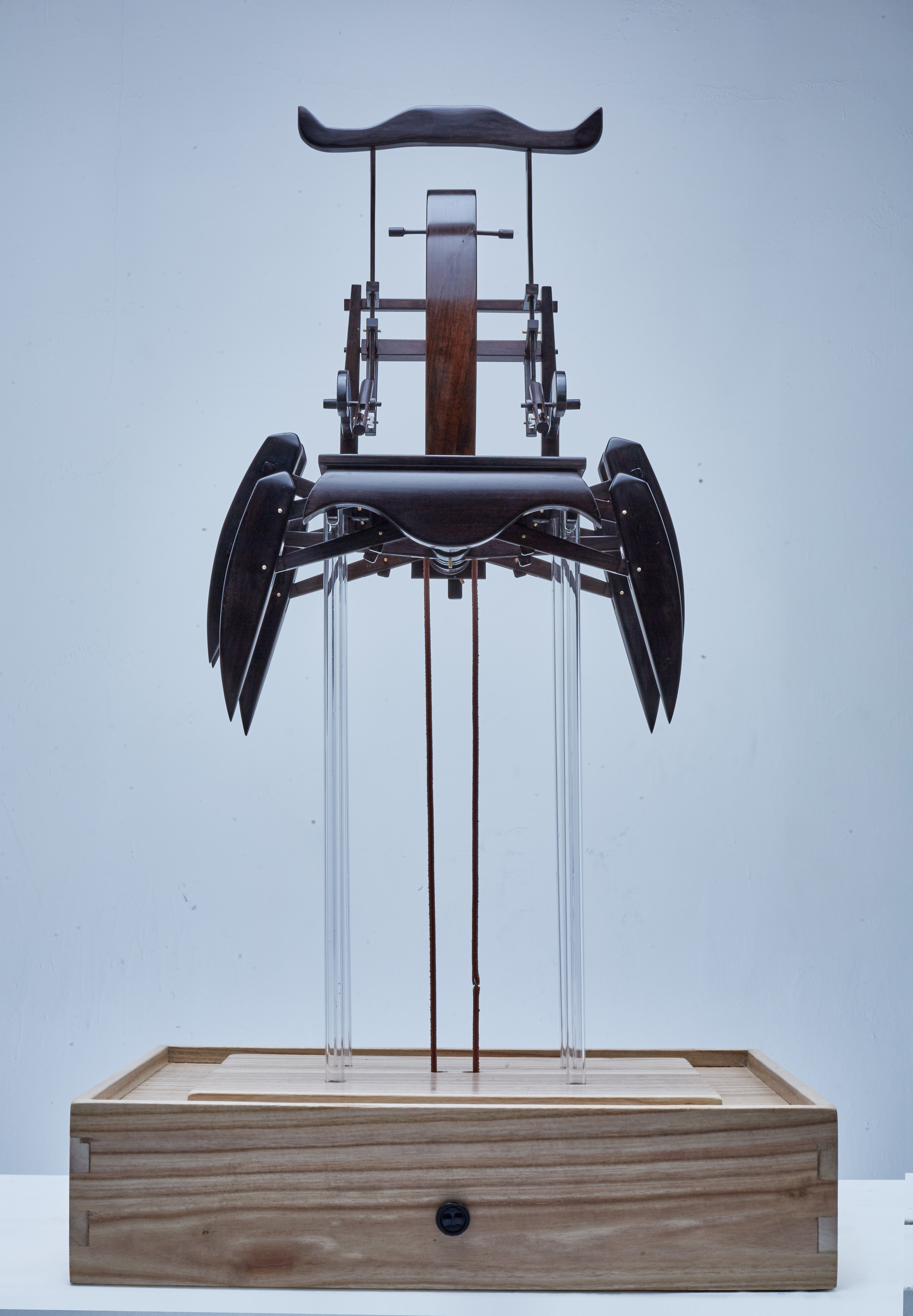 齐雯 & 石英的作品《不可说》运用传统木机械结构的形式,以官帽椅和螃蟹为原型,用动物运动的原理解释静物的活动雕塑,并通过对传统椅子的解构来阐释其内涵。雕塑被艺术家赋予了一种生命的气息,打破了静止的局限。然而现有的活动雕塑多是以西方工业的机械运动为主要形式,那么怎样创作出具有中国特点的活动雕塑就成为齐雯所关注的一个问题。她选择了中国传统的木机械结构为作品的载体。利用活动雕塑与传统造型相结合的独特形式恰到好处地表达出了艺术家本人要说的人与权力地位的话题。