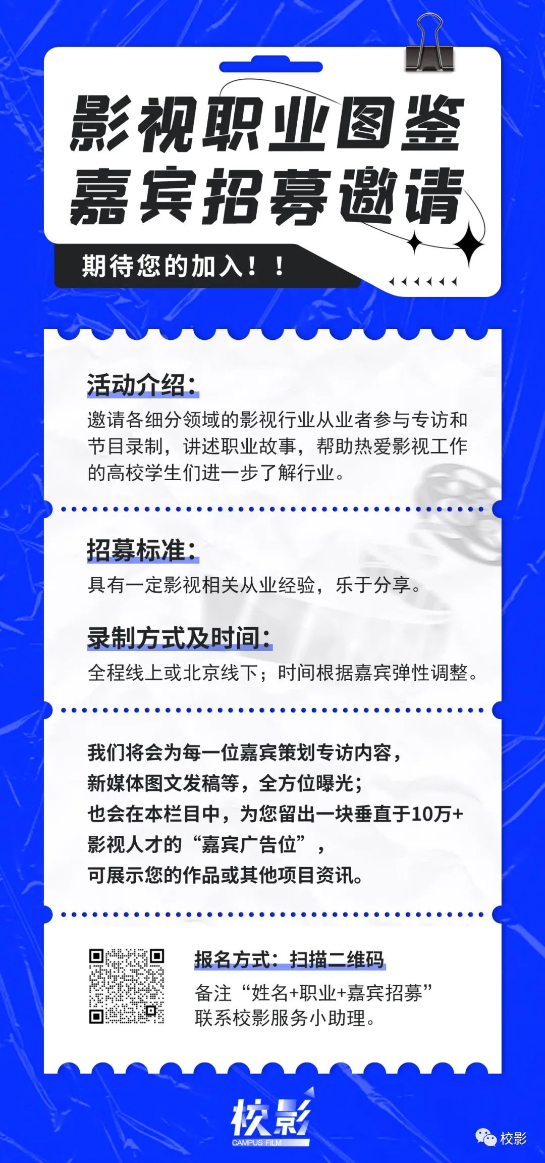 也会在本栏目中,为您留出一块垂直于10万+影视人才的“嘉宾广告位”,可展示您的作品或其他项目资讯。