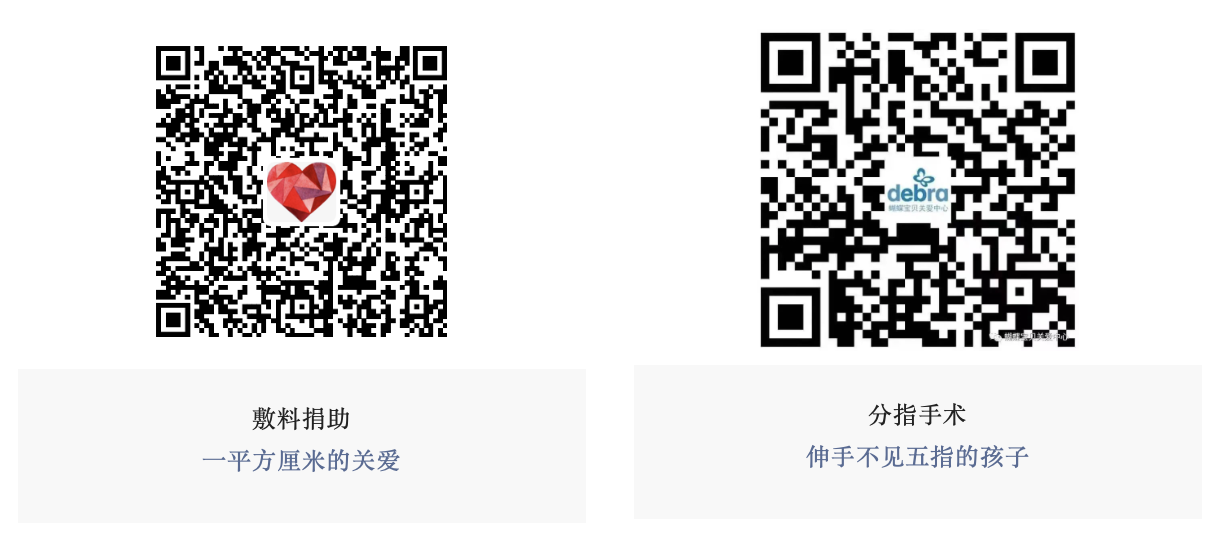 如果你身边有和视频主人公相似症状、尚未确诊的伙伴,可在评论区留言联系我们,或登录官网联系:www.debra.org.cn。扫描下面二维码,你还可以支持更多病友获得敷料捐助和接受分指手术。