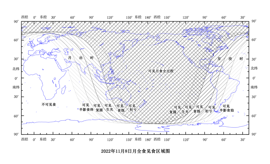 图三:本次月全食见食区域图,节目中的全国见食情况按此图中中国地区从东至西讲述(图片来自紫金山天文台)