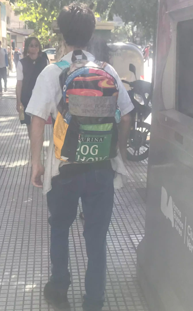 布宜诺斯很多家庭养狗,大街上也经常看到人们用狗粮袋回收加工成的背包