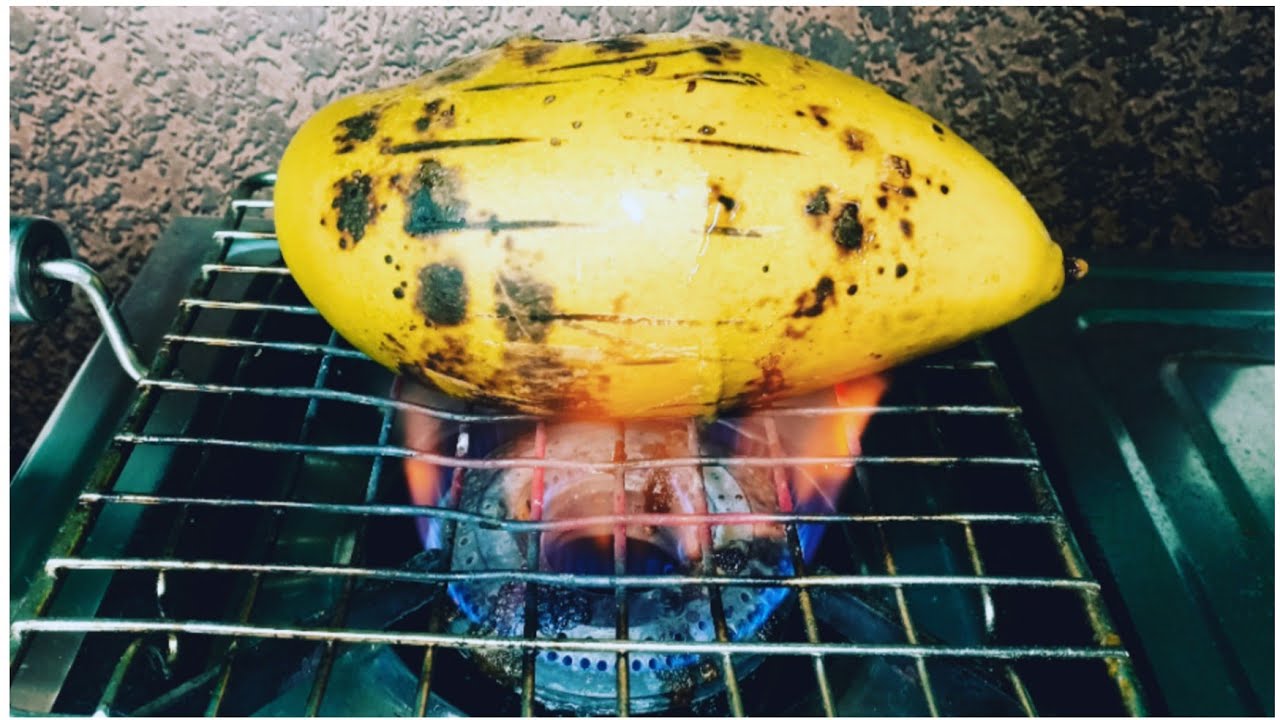 1. 将芒果洗净擦干。在燃气灶顶部放一个烤肉架或烤盘架。把芒果放在上面。