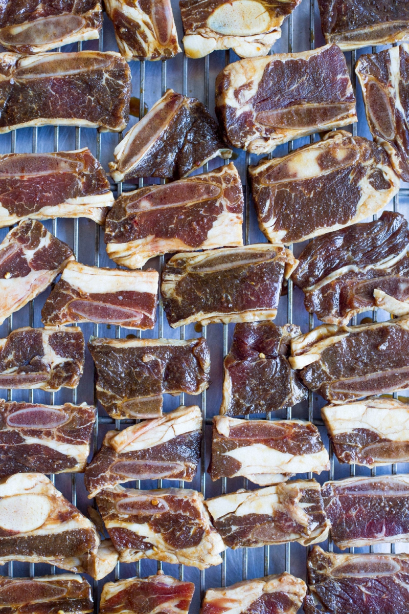 ✔️2. 将烤箱预热至 170F。将短肋骨放在衬有冷却架的烤盘上(您也可以在烤盘上铺上锡纸,这样更容易清洁)。在烤箱中央烘烤,烤箱门打开几英寸,直到大部分干燥(比牛肉干湿一点),大约 6 小时。