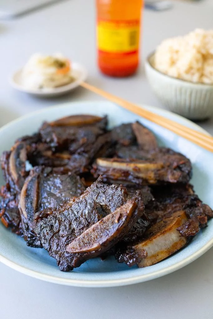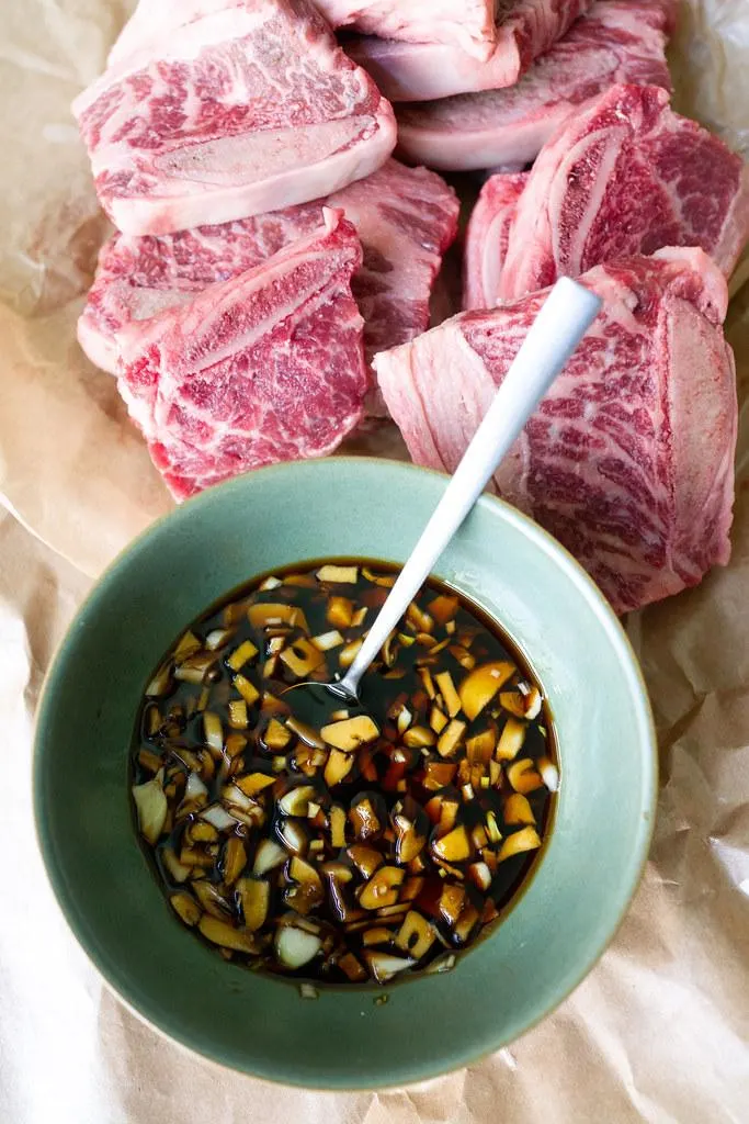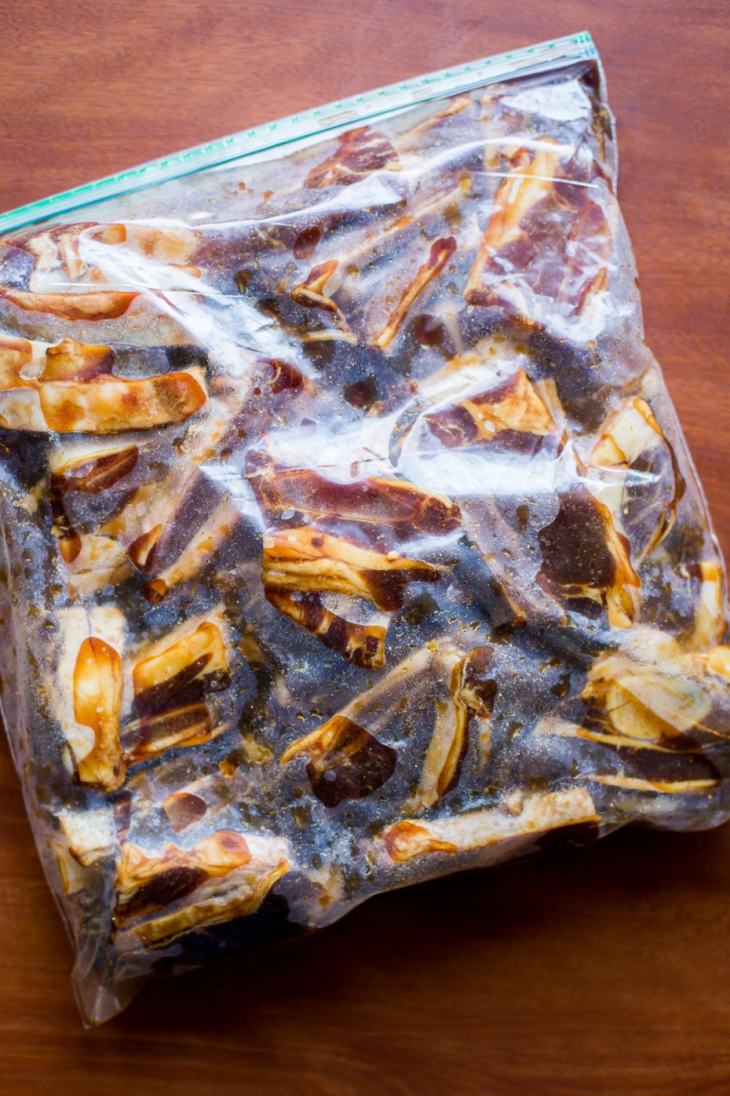 ✔️1. 混合腌料。切割每个骨块之间的短肋骨,形成 2 英寸长的块。将排骨和腌料混合在一个可重新密封的塑料袋中,冷藏至少 6 小时,最好过夜。定期转动袋子。