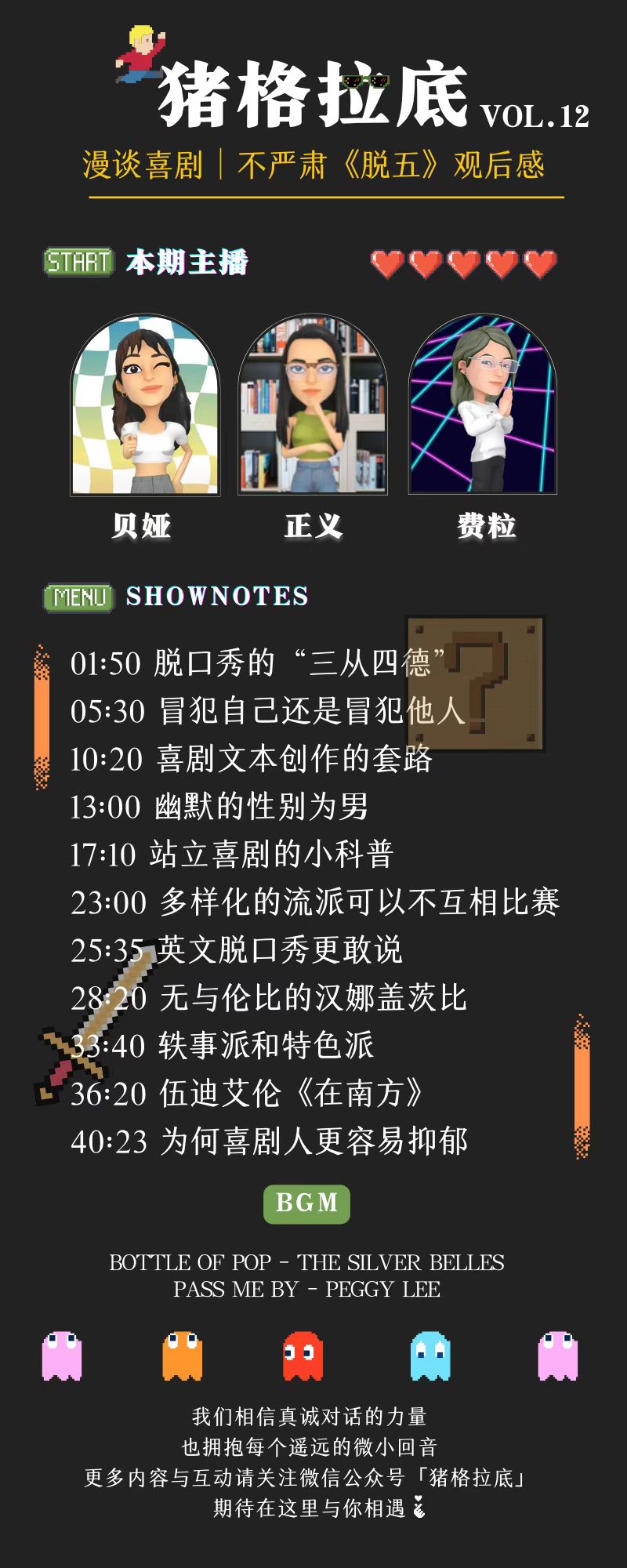 Shownotes01:50 脱口秀的“三从四德”05:30 冒犯自己还是冒犯他人10:20 喜剧文本创作的套路13:00 幽默的性别为男17:10 站立喜剧的小科普23:00 多样化的流派可以不互相比赛25:35 英文脱口秀更敢说28:20 无与伦比的汉娜盖茨比33:40 议事派和特色派36:20 伍迪艾伦《在南方》40:23 为何喜剧人更容易抑郁