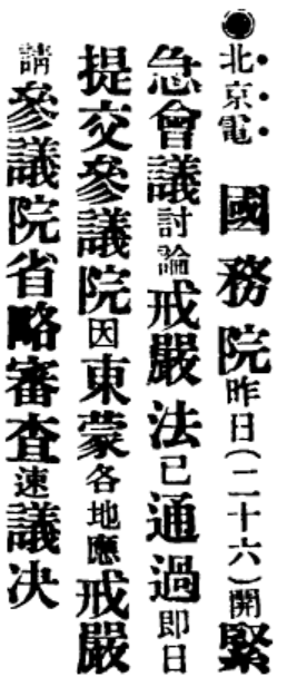 TOP1:国务院二十六日开紧急会议,讨论戒严法,已通过。即日提交参议院,因东蒙各地应戒严,请参议院省略审查速议决。1912年11月28日《申报》一角TOP2:津浦铁路货捐局昨被匪徒多人捣毁一空,并殴伤局员数人,业已报告都督核办。民国时期”津浦铁路全图”TOP3:汉口总商会总协理李紫云蔡文忠二君于昨日邀请全体会员开会集议,支持武力解决库俄条约。民国贴长城图及加盖“汉口总商会”印花税票汇票