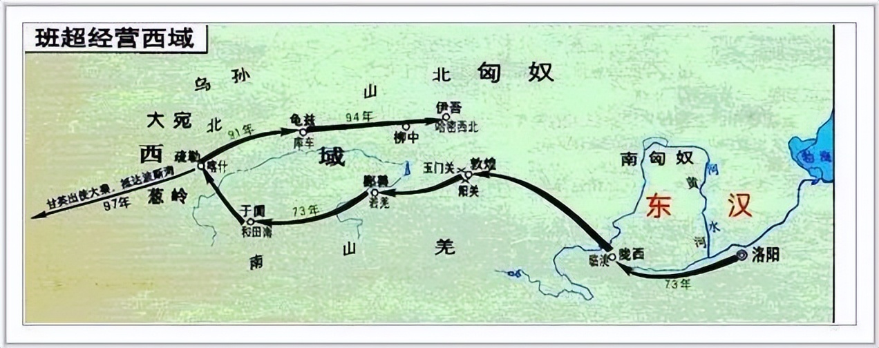 正好这个时候,中国的西北边疆发生了战乱,我们知道西域很多的小国从自王莽篡汉之后就脱离了中央王朝的管辖,被北匈奴控制。北匈奴得到西域的人力、物力后也是胃口大增大增,开始进犯河西诸郡,使得边地人民不堪其苦。于是中央决定解决边患问题,班超抓住机会就从军了,在一个叫窦固的将军的北伐军中担任假司马(就是代理司马)。班超一到军队,个人才能就体现出来。亲自率兵进攻伊吾,就是今天新疆哈密一代,大败北匈奴,斩敌首甚多。这一仗也奠定了班超在军队中的地位。窦固一看这哥们可以呀,于是派班超出使西域,主要任务是搞统战,联络西域各国一起对付匈奴。
