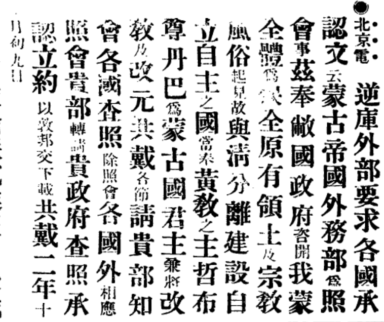 TOP1:逆库外部要求各国承认文披露,正式宣布独立。俄政府宣言俄皇将正式接待库伦专使。1912年12月22日《申报》一角TOP2:俄政府派俄兵一百六十九名,于二十日晚间由长春起程来京,保护该国使馆。北京俄国公使馆大门TOP3:财政部据上海道胜银行代表郭业尔函称华商连日向该行提款已达三百八十万两,恳请设法维持。1914年上海华俄道胜银行壹佰圆试色样票