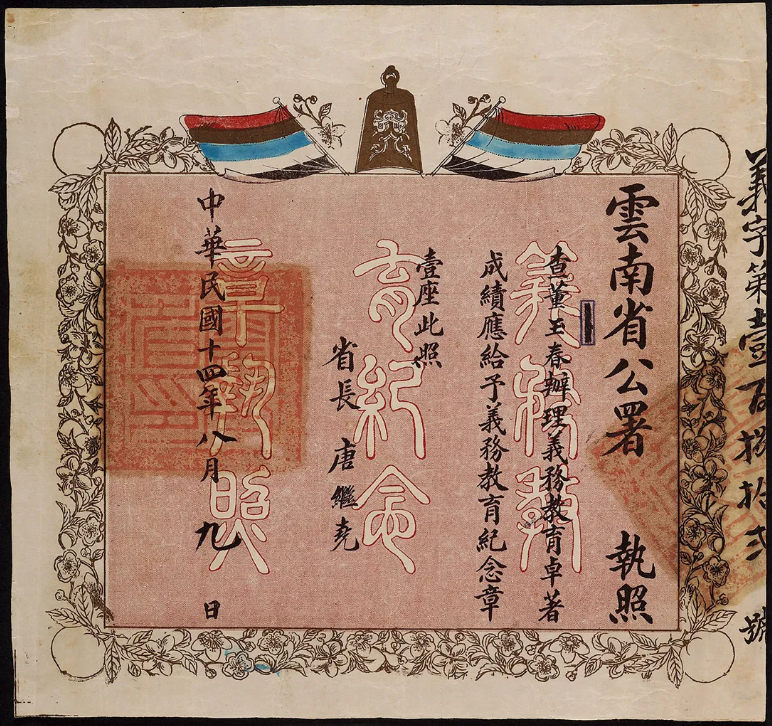 TOP1:中央拟召集全蒙大会,已由蒙藏事务局拟定草案,送交国务院,俟会议通过后,于二月初旬举行。1912年12月23日《申报》一角TOP2:教育部义务教育法,规定满六岁之儿童,必须受初等小学教育,且责成其父兄有迫令入学之义务。民国十四年(1925)云南省公署义务教育纪念章执照TOP3:十二月二十号下午一时国民捐总会在事务所开会讨论取消办法,各团代表皆到会。余款拟拨入救蒙联合会。中华民国元年(1912)收据·捐助国民捐银伍大员