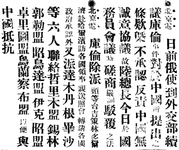TOP1:日前俄使到外交部续议库伦事件,对于中国所提出之条款概不承认。库伦又派人联络内蒙各盟,以便与中国抵抗。1912年12月25日《申报》一角TOP2:北京宛平商人入场投票时被剥夺选举权,群情激奋,声称将以武力对待。民国(京兆宛平县北辛安磨石口村)新安矿业股份有限公司股票TOP3:日本某青年潜入山县公爵私邸谋刺未遂,服毒自尽。山县有朋