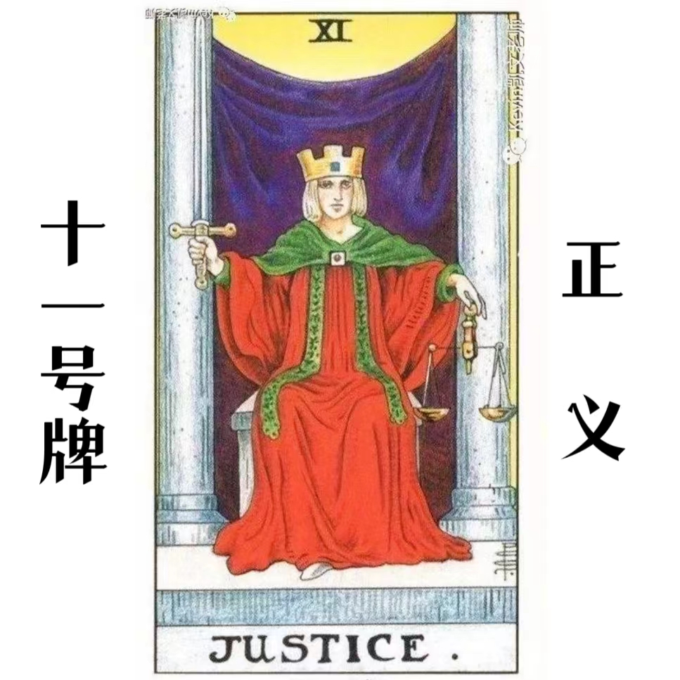 许多象征元素出现在这张牌面上,我们在之前已经仔细分析过,它们分别是:长袍,皇冠,宝座,宝剑,正方体和两根柱子。这里的两根柱子代表生命的两股主要驱动力:积极和消极。这张牌的一切都强调着公正与平衡。他手中拿着的天秤是这种状态最显著的代表。金色的天秤平衡了天堂和人类的法律。这张牌让人联想到天秤座,守护星是金星,对应爱与美的女神阿芙洛狄忒。天秤座也对应人类的肾脏和泌尿系统,都是排毒器官。所以正义牌指出我们必须排除个人生活中一切阻碍和谐结果的表达形式。只有这样神圣的正义才能获胜,将正确的行动赋予我们生活的外部环境中。