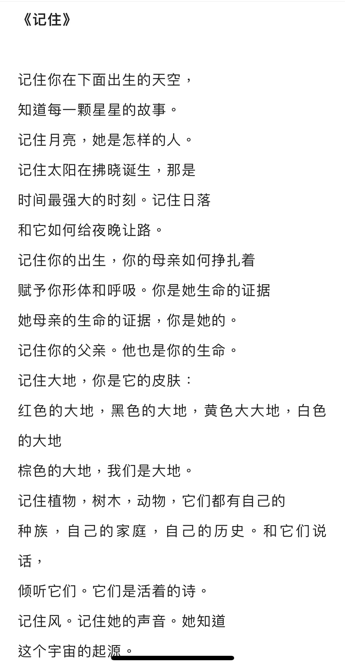B站听了乔伊·哈乔的诗歌课。什么是诗意?或许逃脱日常的生活与习惯的bling时刻。哈乔说,诗是灵魂有个地方得以伸展,喜欢。这首《记住》写的是出生之前,带去的叮嘱,不要忘却。