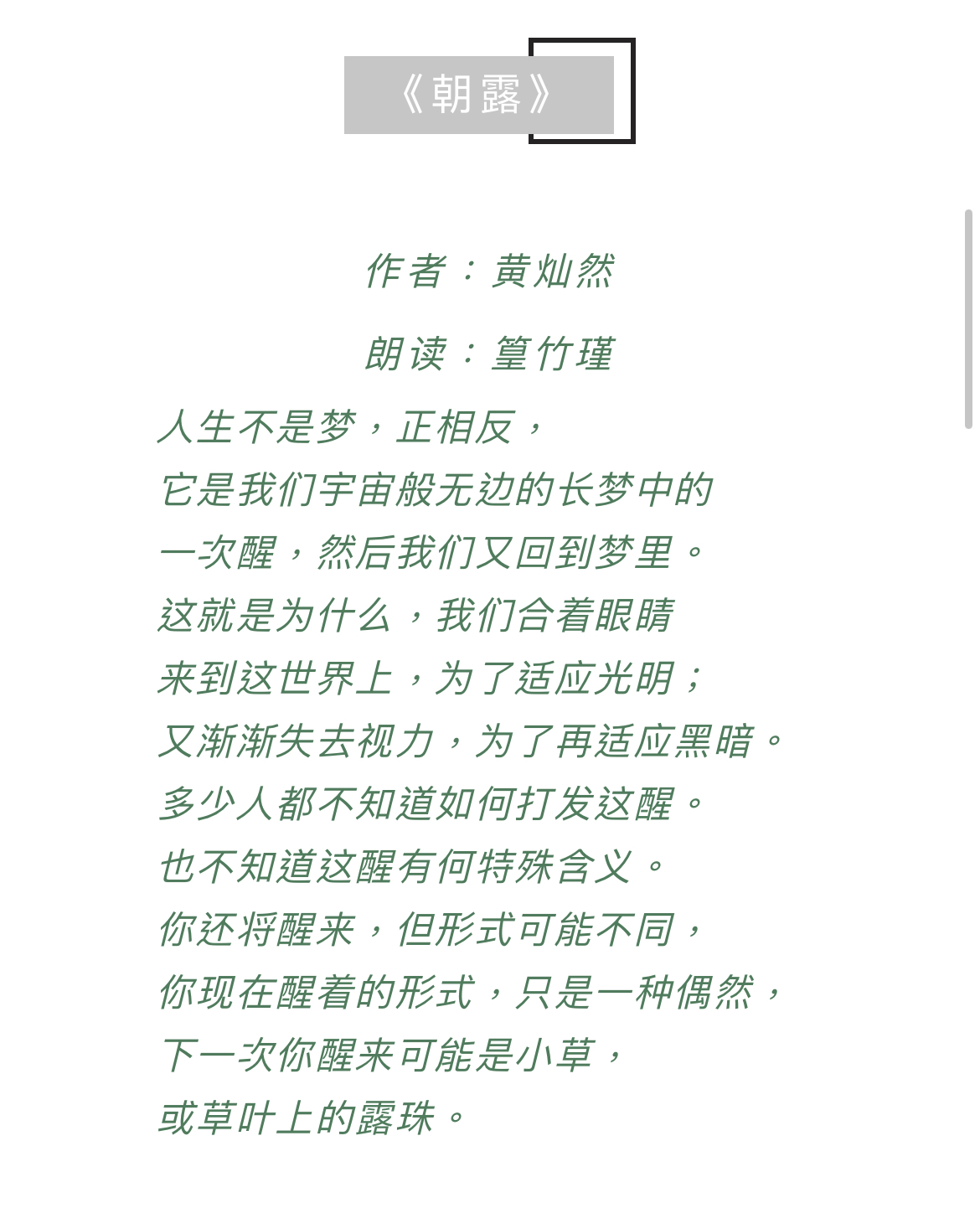 如果人生是不断忘记,不断在昏沉中醒来,你在何处觉醒?你有几次醒来?黄灿然的“朝露“说,人生不是梦,正相反,它是我们宇宙般无边的长梦里的一个醒。那么不容易的“醒来”,我们可以做些什么呢?