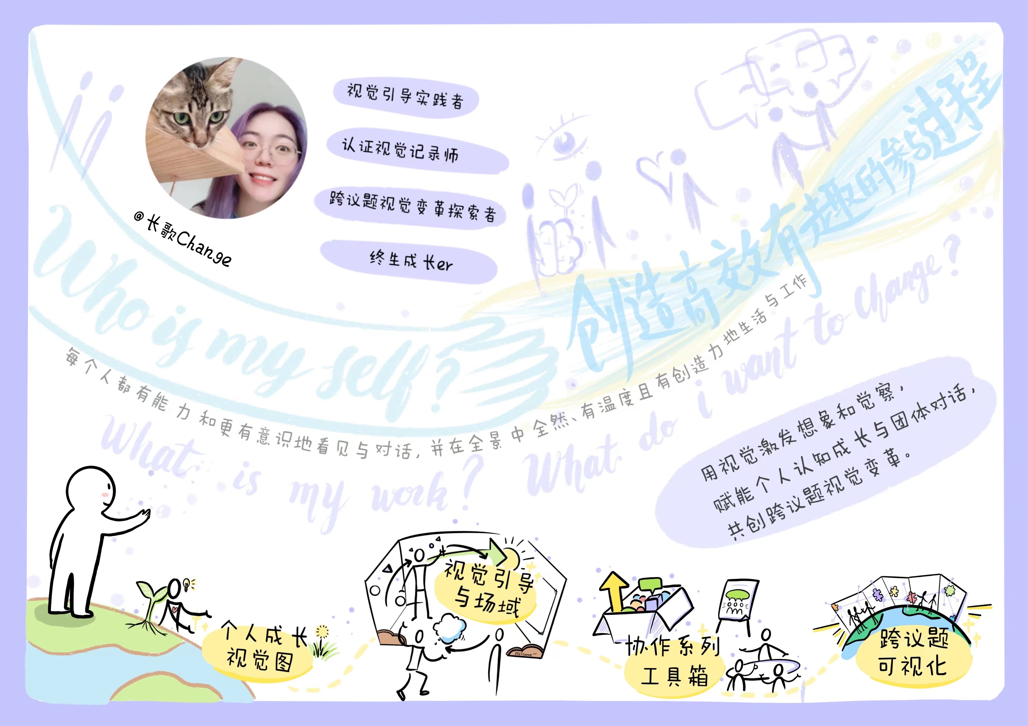 今天我们请到的嘉宾叫做长歌,她是一名跨议题视觉引导实践者。2022年,她逐渐从组织离开,开始创业之旅......下方这张图就是长歌的介绍啦!