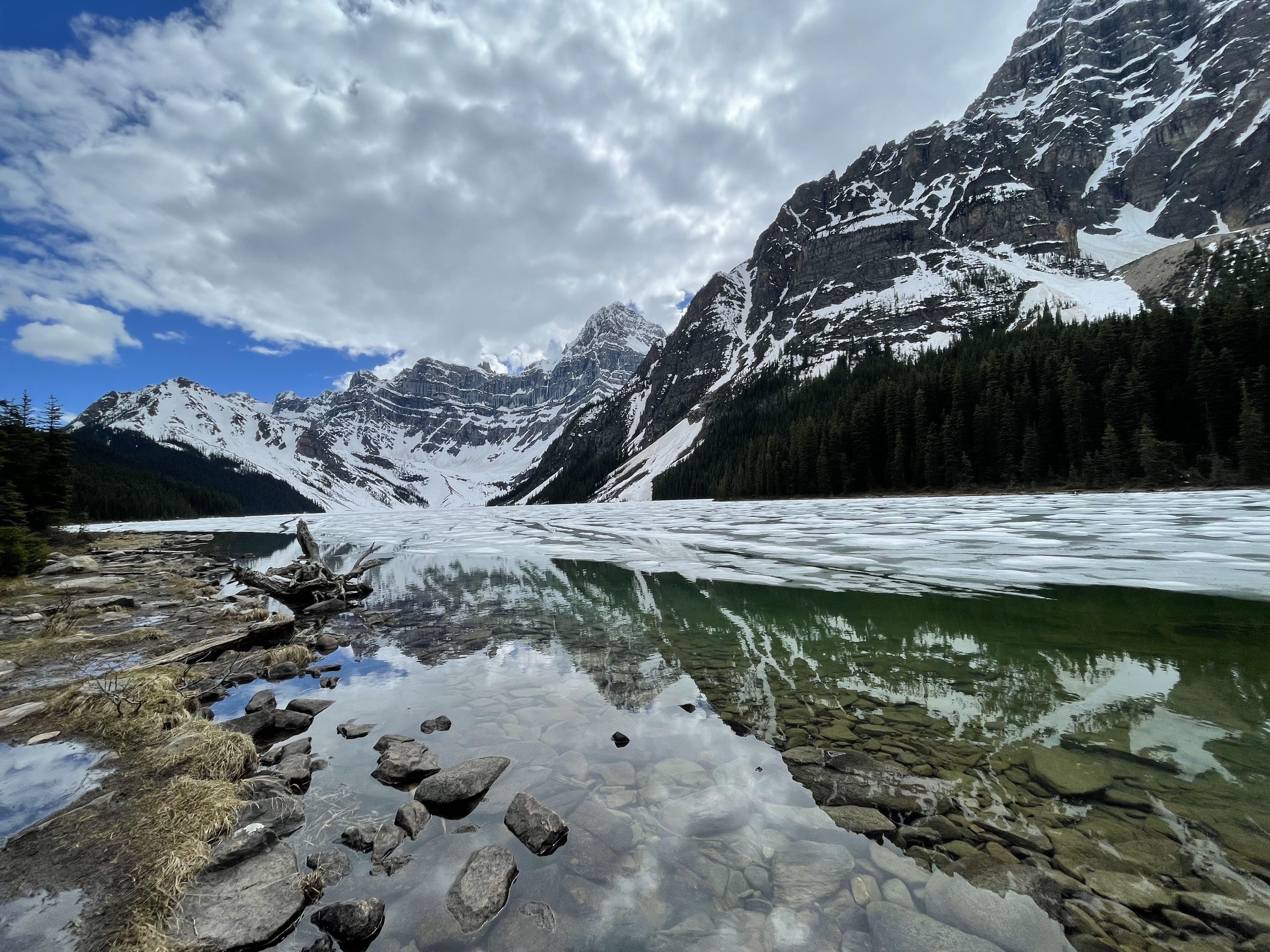 加拿大班夫国家公园结冰的湖,听到的雪崩就是从远处的山上传来的