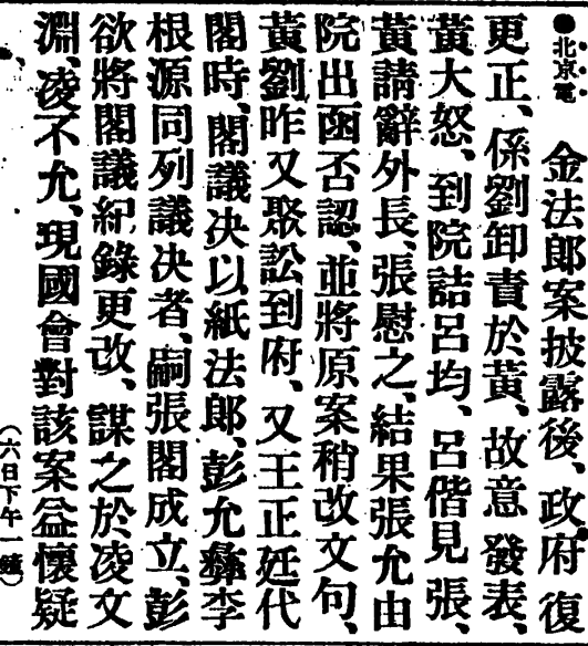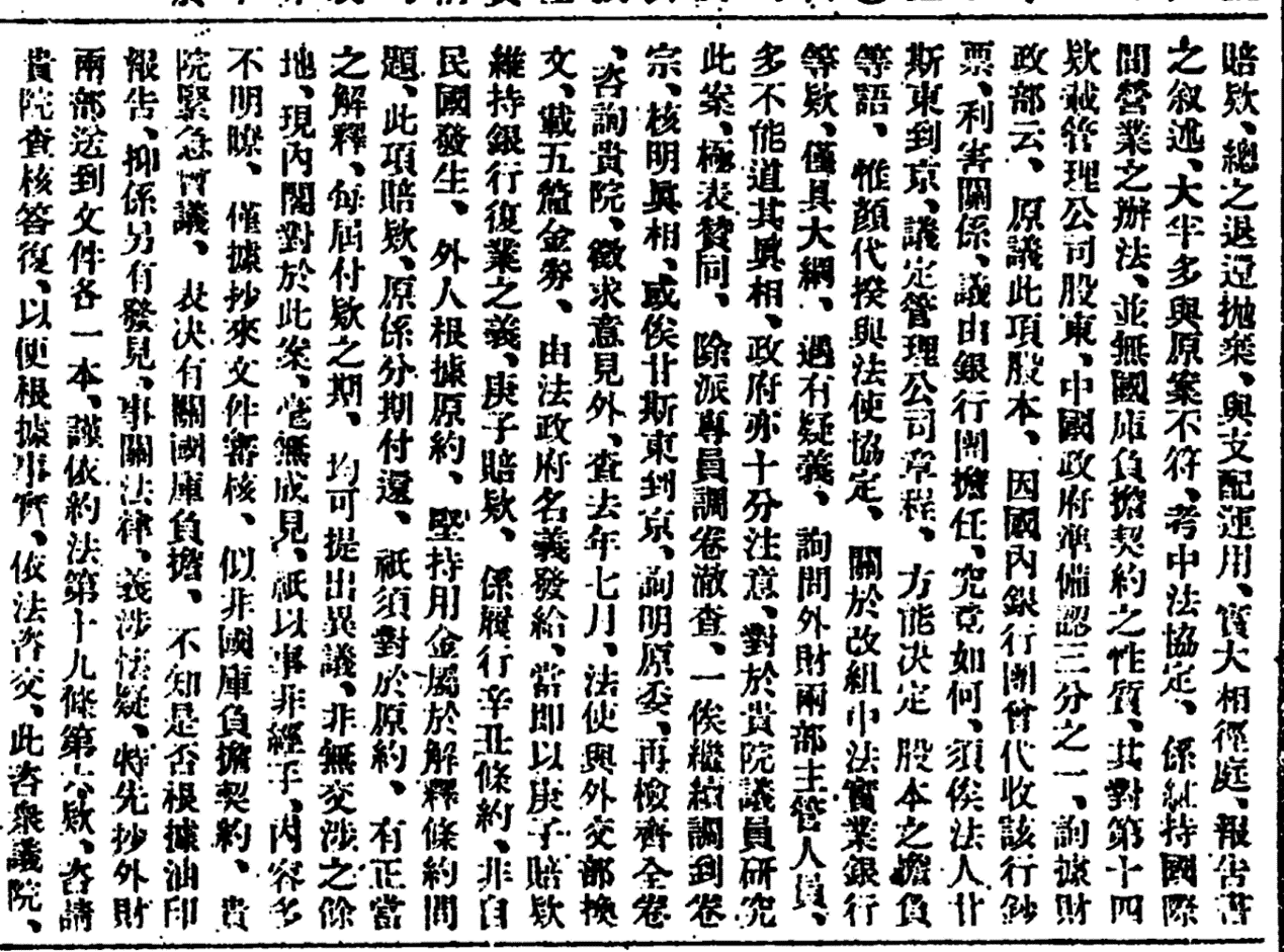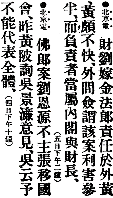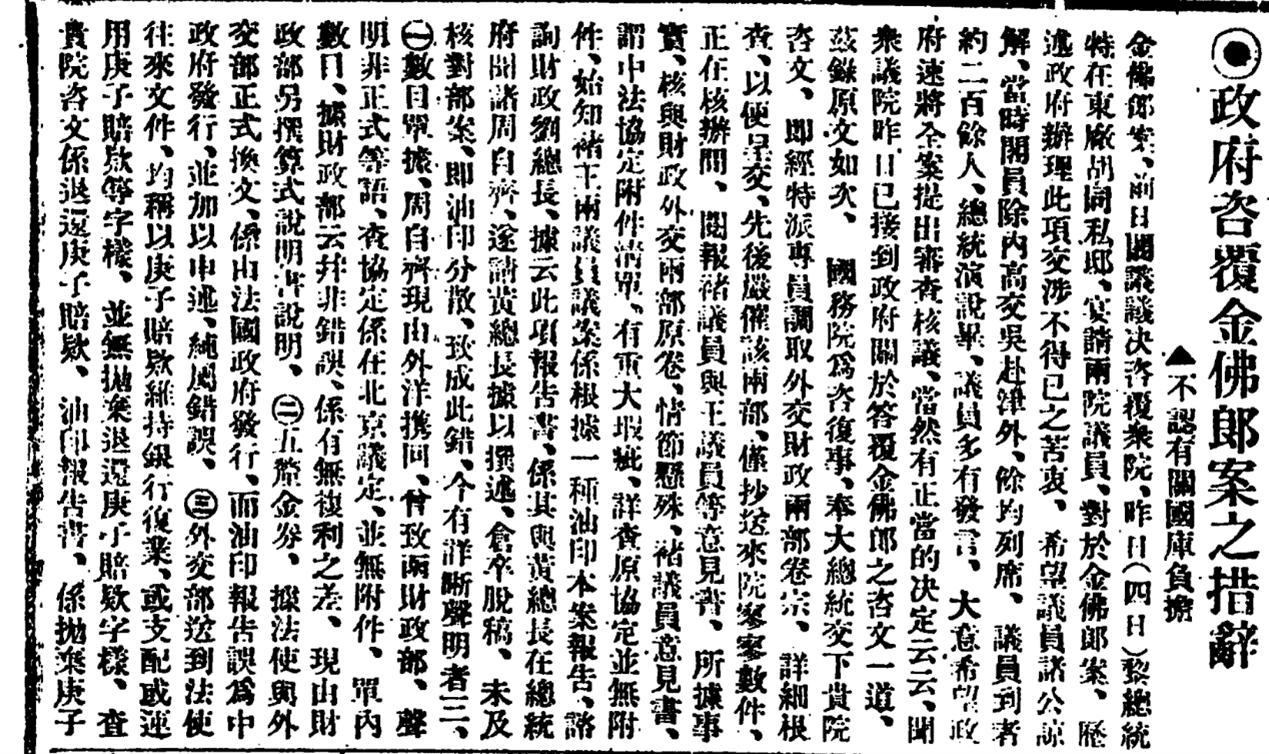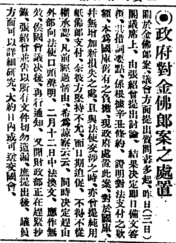 2. 金法郎案财政部与外交部继续推诿,内阁与国会互相扯皮。北洋为能早日与法国妥协各种为对方开脱。