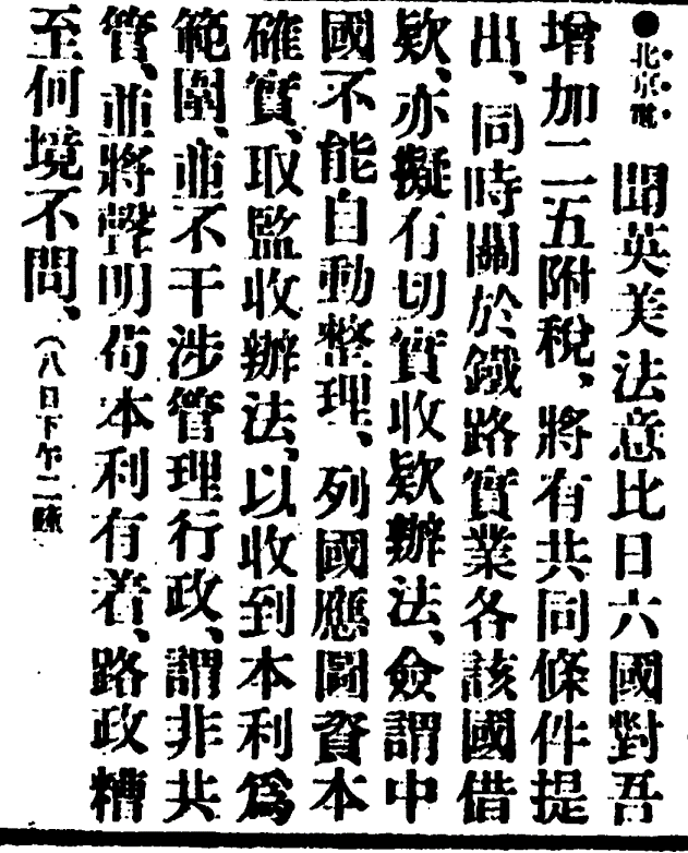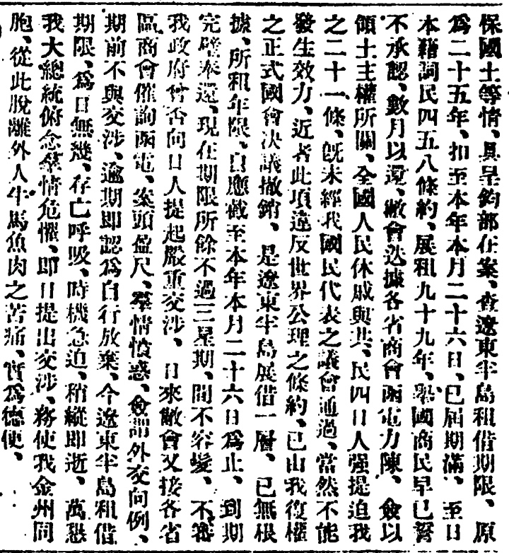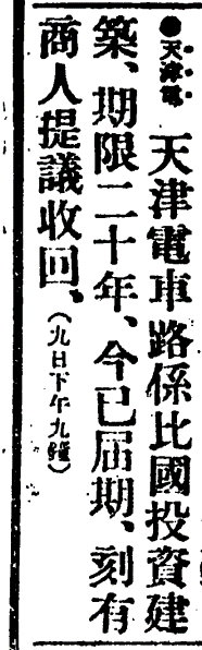 d) 天津电车线路系比利时投资建筑,期限二十年。今已临近期满,有人提议收回。