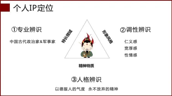 这里将长期用到一个独家方法论:【IP三边定位法】它适配品牌IP、文化IP,也适配个人IP,由专业辨识、调性辨识、人格辨识构成,简单讲就是事儿、范儿、魂儿。