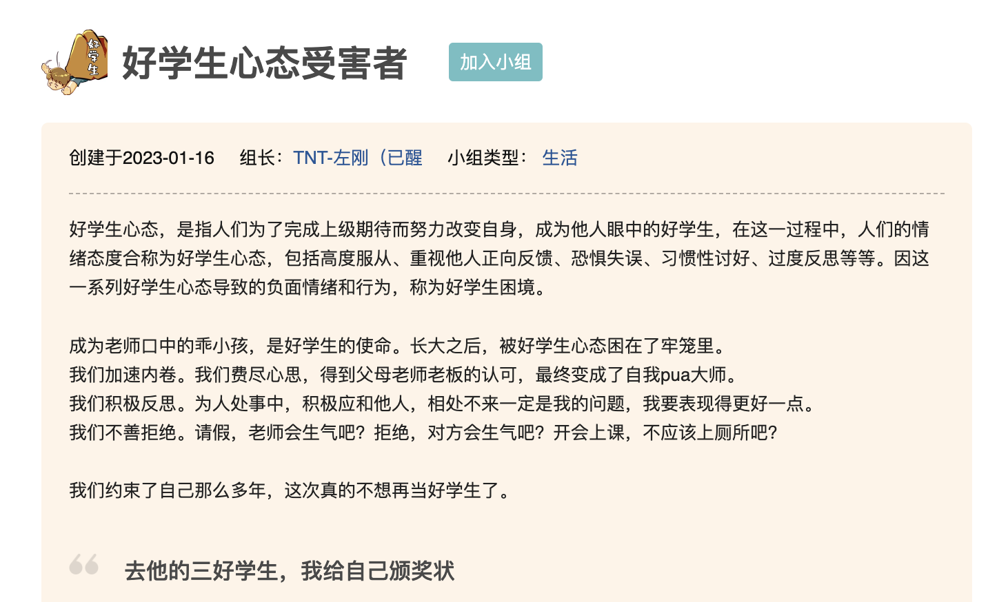 2023年1月16日,一个名为「好学生心态受害者」的豆瓣小组诞生。在这个拥有5.4w友邻的小圈子里,每个好学生的故事都如此相似:小时候,为了成为大人眼里的好孩子,我们一度用尽全力。长大后,我们依然保持好学生思维,成为自我PUA大师。