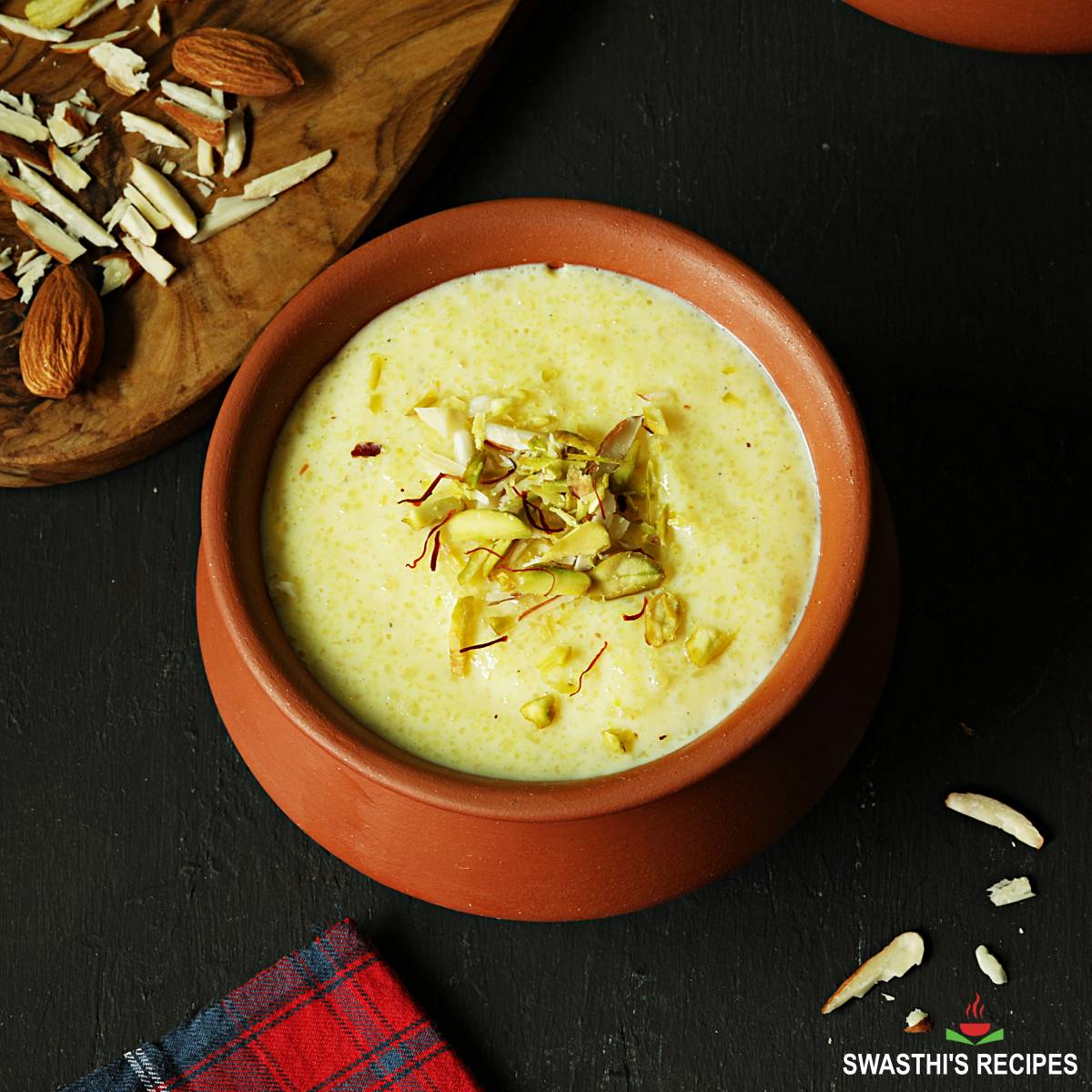firni:一种经典的慢煮印度甜布丁,由印度香米、牛奶、坚果、糖制成,并加入豆蔻粉或藏红花或玫瑰水。