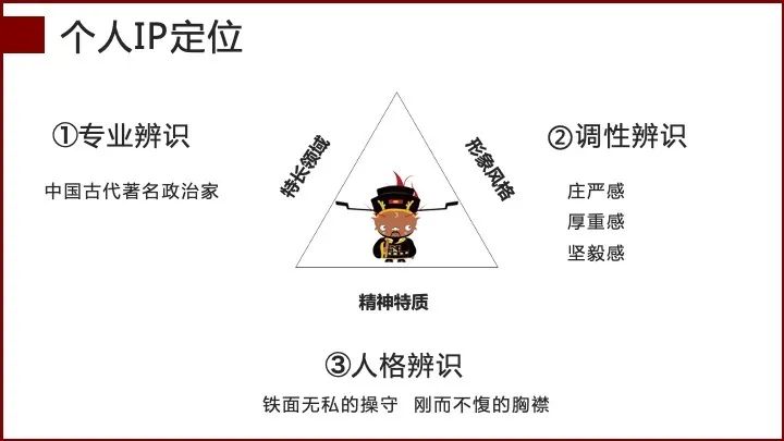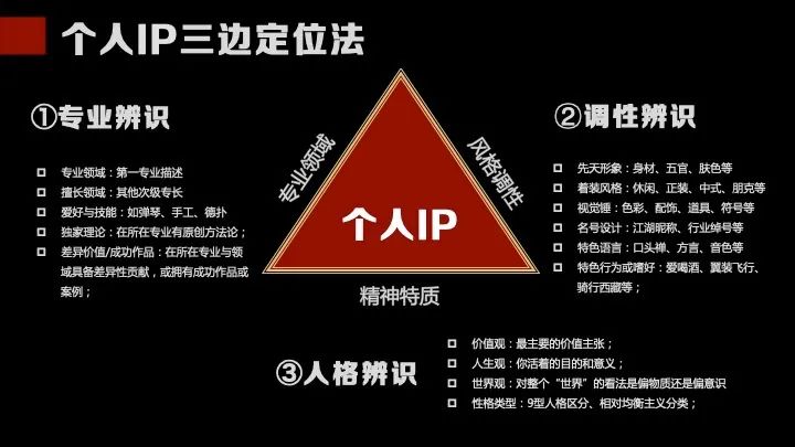 这里将长期用到一个独家方法论:【IP三边定位法】它适配品牌IP、文化IP,也适配个人IP,由专业辨识、调性辨识、人格辨识构成,简单讲就是事儿、范儿、魂儿。