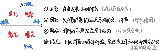 22.科尔勃他从两个维度来考虑认知风格,即具体体验—抽象概括维度和反省性观察—主动实验维度,然后,他由这两个维度构成了一个坐标系,确定出四种学习风格:发散者方式、同化者方式、聚合者方式和顺应者方式。