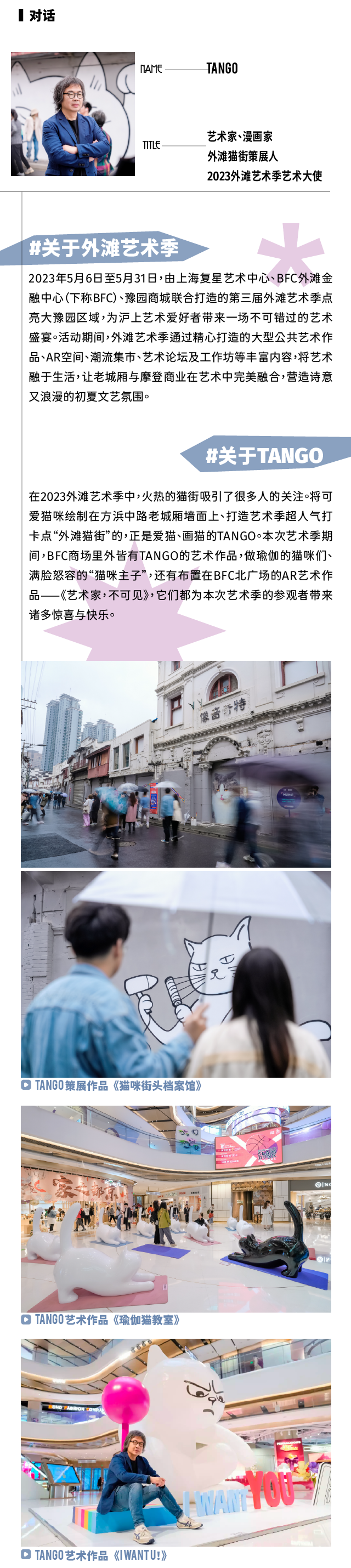 00:45 Tango:我是一个带有广告印记的漫画家02:02 外滩网红猫街的诞生05:40 构建一个微缩社会场景:猫是最像人类的一种动物07:00 外滩艺术季展出作品的背后含义08:05 一个异世界窗口:“猫之家”沉浸式AR体验10:00 AI智能 VS 艺术家和广告人12:22 如何成为一个“艺术家”?干货来袭!14:30 如何获得外滩艺术季 X Tango 限定周边礼包?!