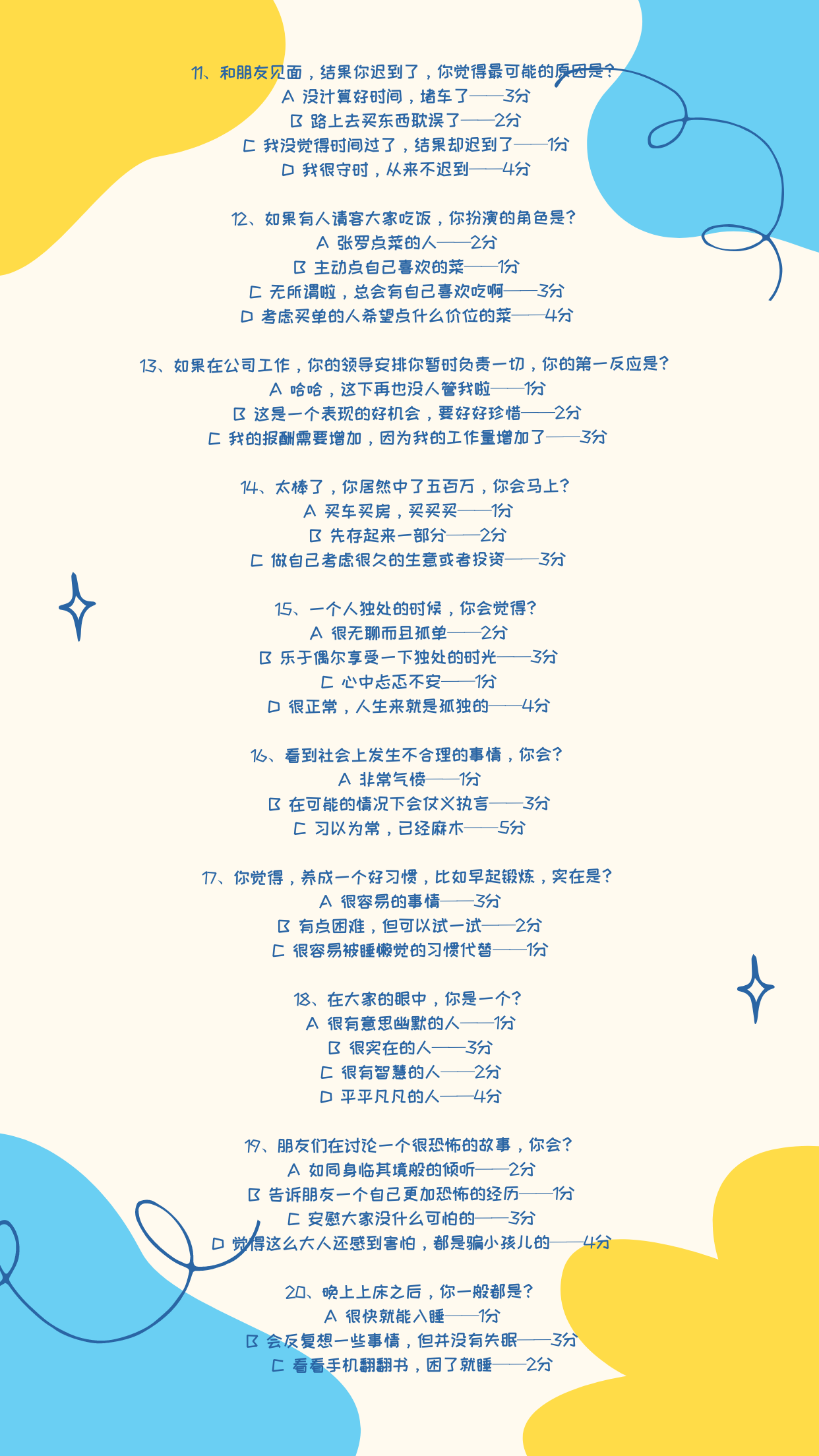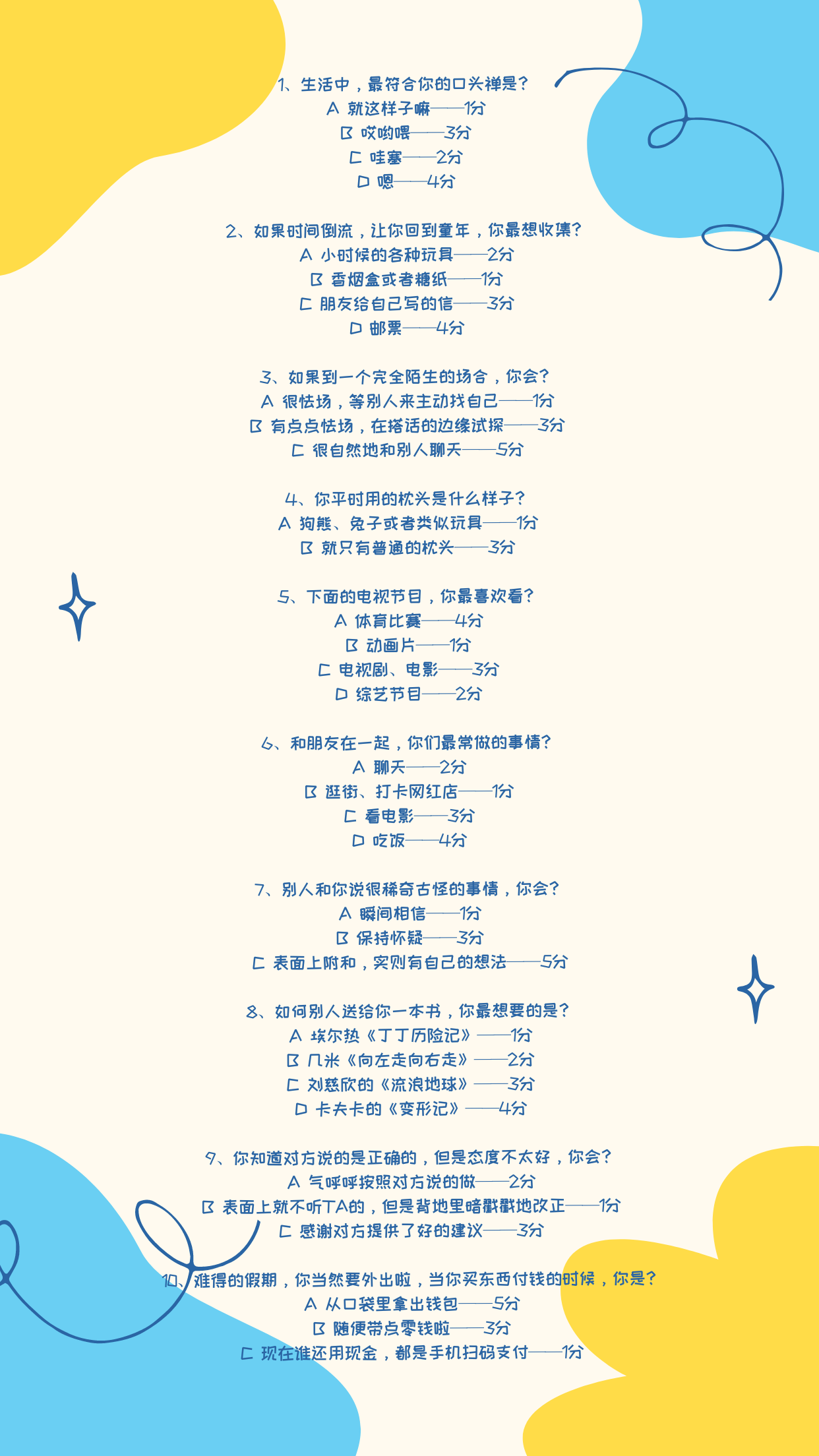 这期照顾大家还是宝宝👶🏻我们把题目及选项对应分数列出,分数相加即可得到最终答案,测试开始!