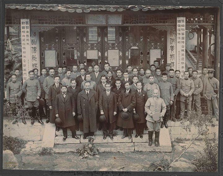 1912年3月29日,南京临时政府各部总次长、卫戍总督、各军师旅司令官,在南京愚园(胡家花园)的春晖堂为孙中山举行饯别会。最前面一人:王芝祥;第二排左起:黄兴、唐绍仪、孙中山、王宠惠、吕志伊;第三排左1马君武、左2俆绍桢、左4魏宸组、左5黄钟英、左6黄郛、左7朱瑞、左8姚雨平;第四排左2陈懋修、左3柏文蔚、左5居正、左6景耀月、左7蔡元培、左8王鸿猷、左9朱卓文。
