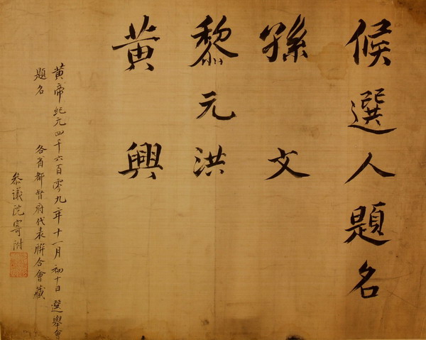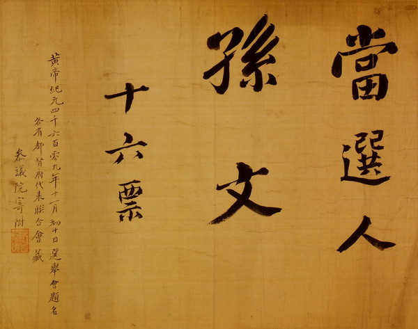 各省代表均希望收藏選票。經參議院同意,江蘇代表袁希洛以墨筆在長方形毛邊紙上按原選票的格式抄寫17份,補寫題識,加蓋參議院章之後交各省收藏。