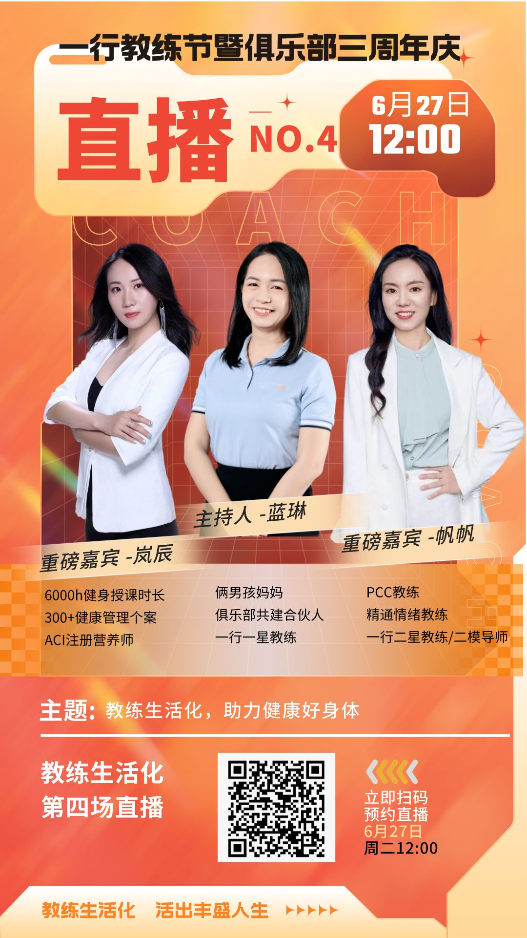 本期节目是教练节暨俱乐部三周年庆典的第四场直播,通过教练生活化,活出丰盛人生。这场直播主题是教练生活化如何助力健康好身体,希望通过连续的这几场直播,让大家看到教练技术怎么更好在生活当中做应用。今天的直播,是由蓝琳教练对谈一行教练俱乐部的共建合伙人岚辰教练、还有PCC教练帆帆教练。收听本期节目,你将了解到一行的教练们,是如何在她们生活中,结合教练思维,达到轻松愉悦的生命状态。